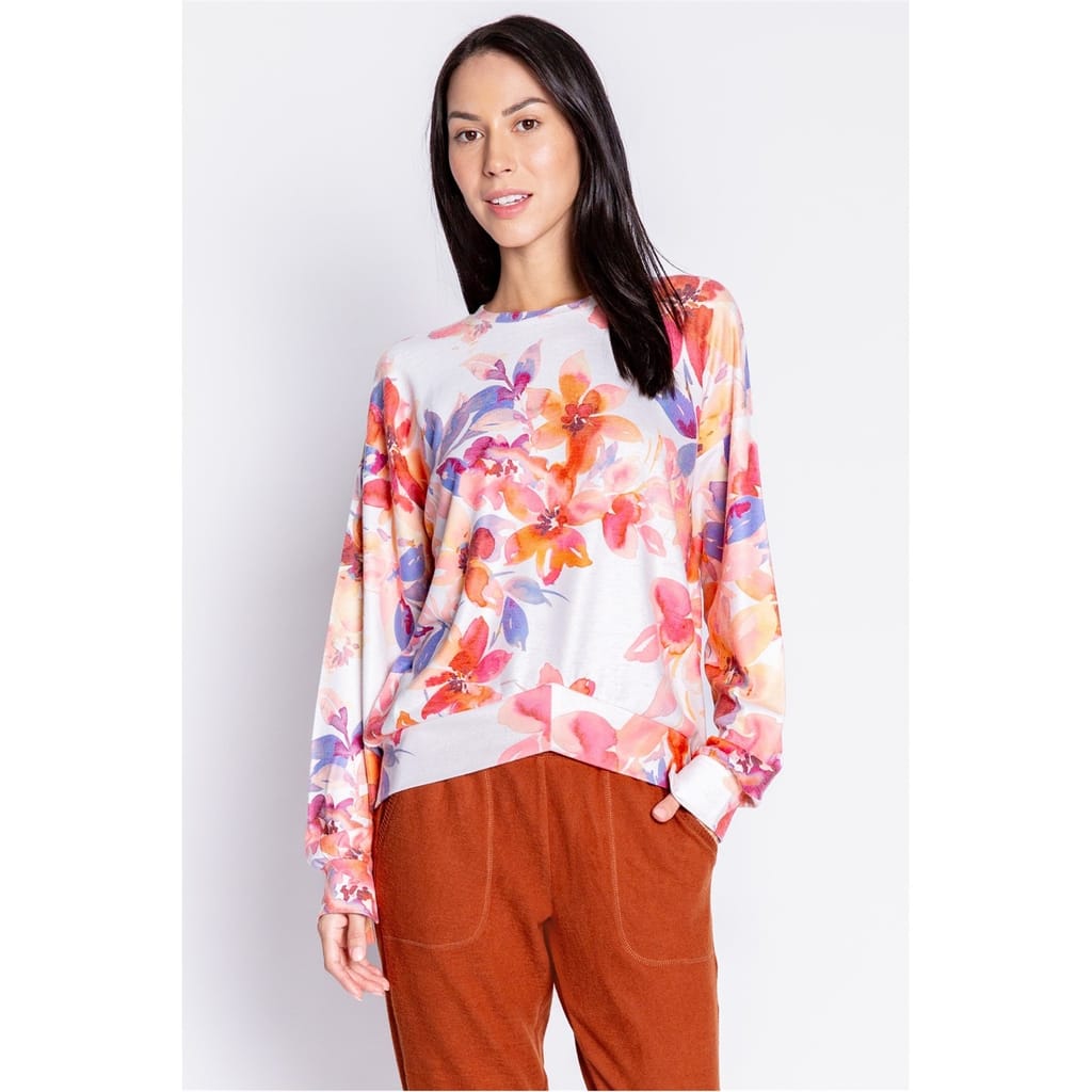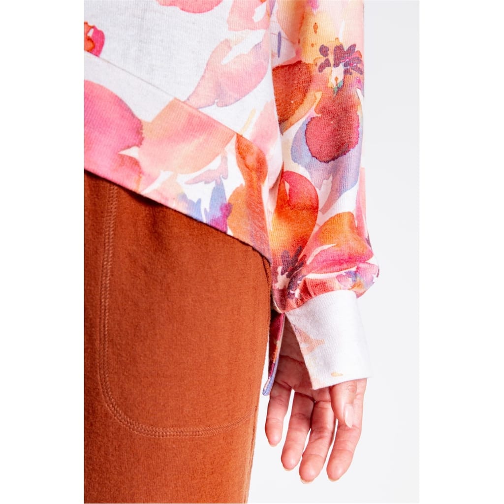 Bring a soft, seasonal touch to your wardrobe with this peachy top, printed in delicate autumn watercolor florals. Designed with a flattering banded hem and chic split cuff detail, it’s an easy piece that balances comfort and elegance for everyday wear. -