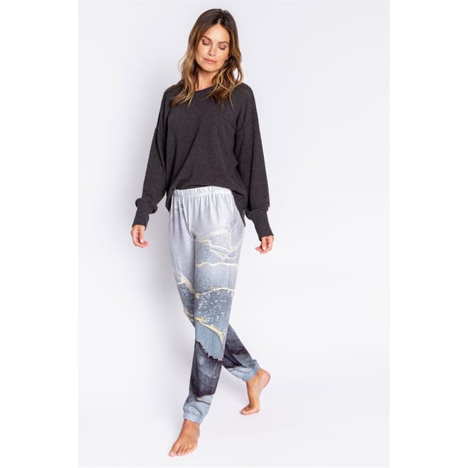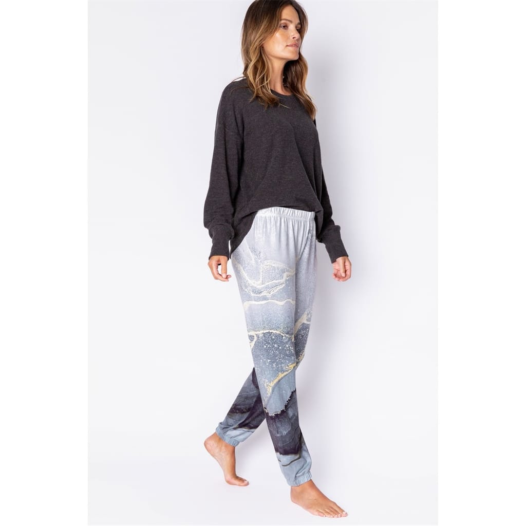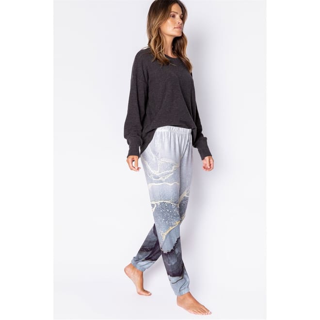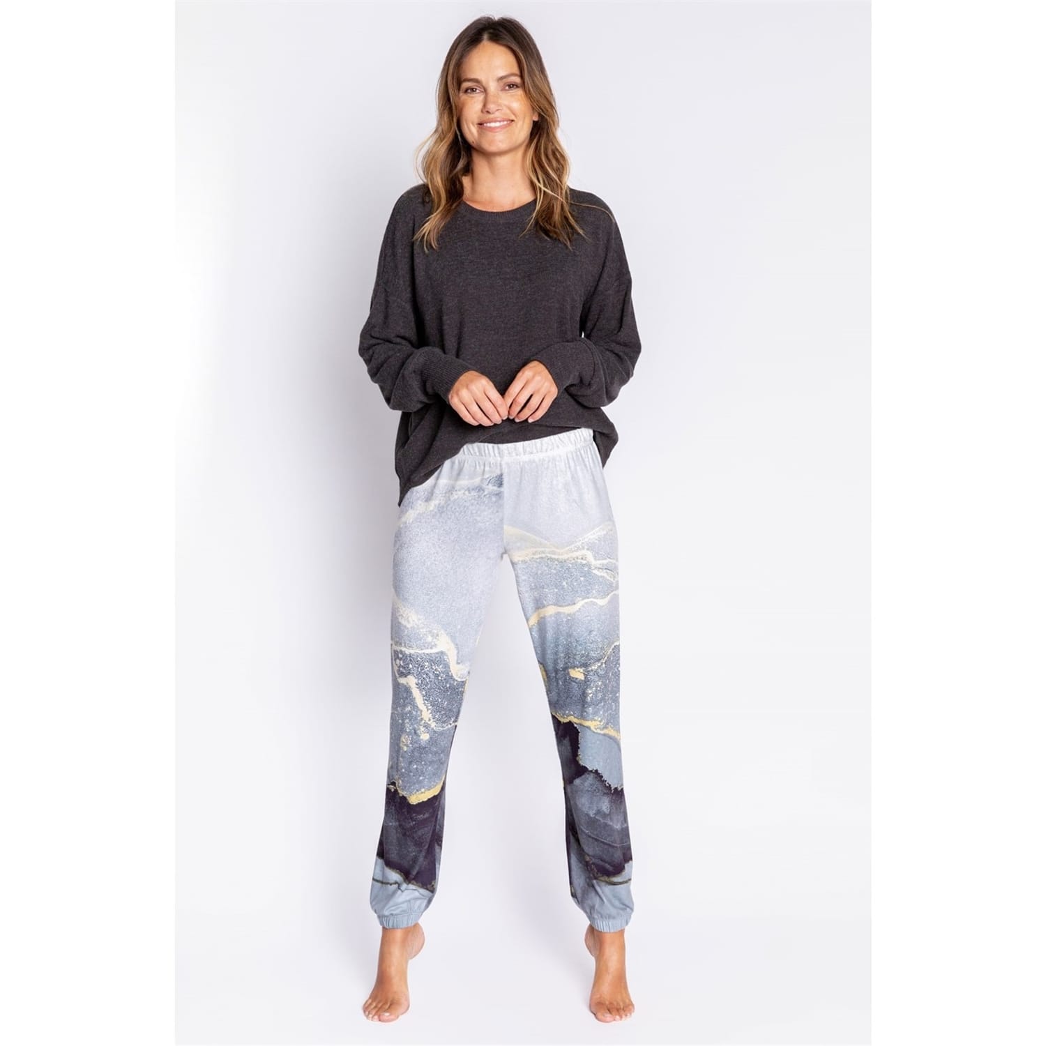 Relax in style with these lounge trousers, designed in a striking black-grey marble sublimation print with a hint of gold accent. Crafted for comfort with a relaxed fit, they bring a modern, luxe twist to everyday loungewear — perfect for pairing with the matching top or mixing into your casual wardrobe. -