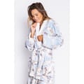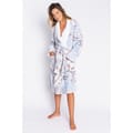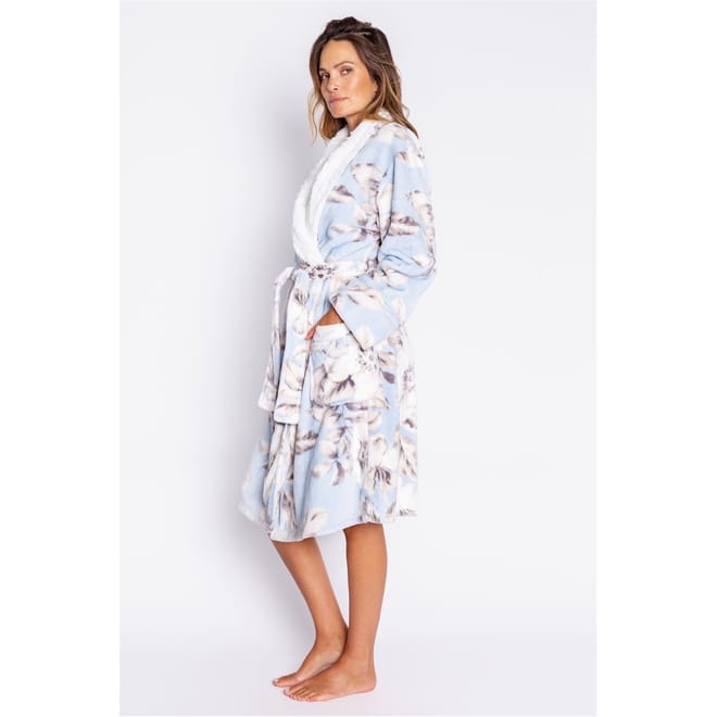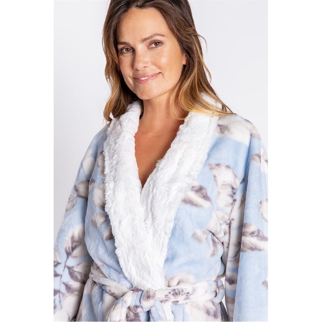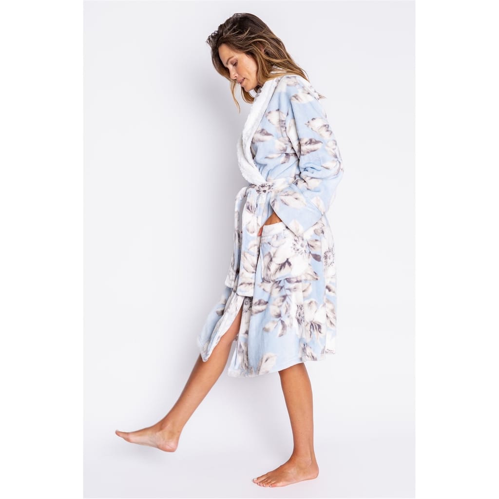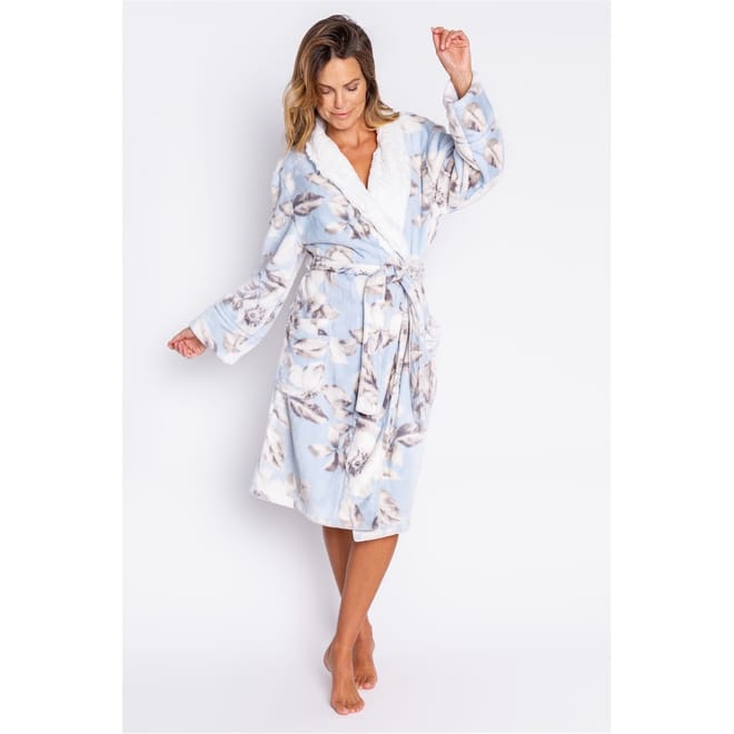 Elevate your lounge look with this silky luxe plush robe, adorned in a soft blue-grey floral print. Finished with an ivory shawl collar and roomy patch pockets, it’s the perfect blend of elegance and everyday comfort — a cozy layer you’ll never want to take off. -