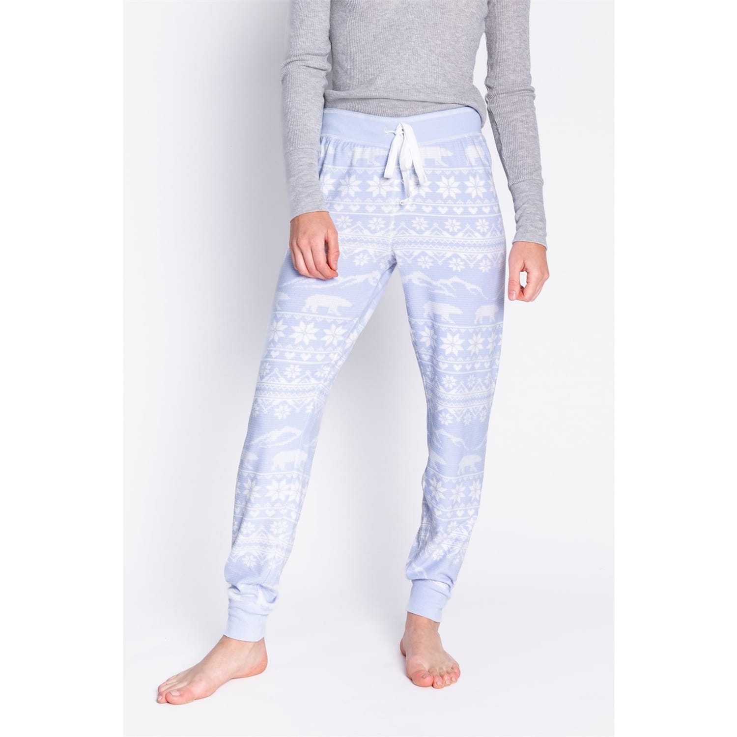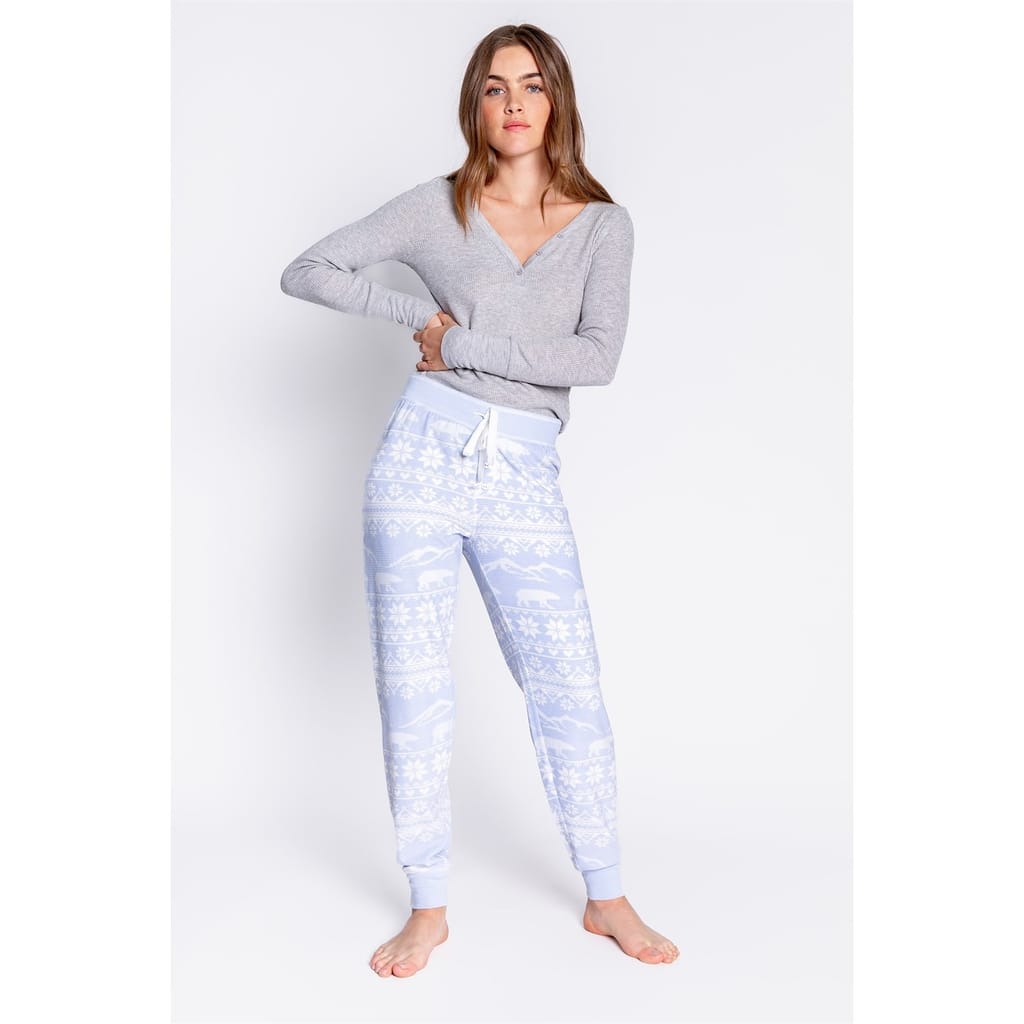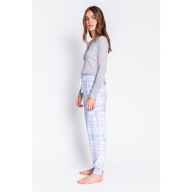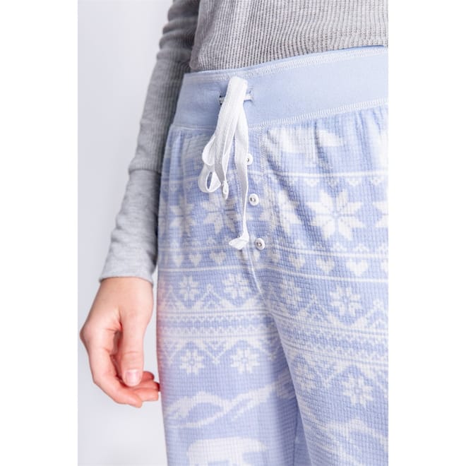 Finish the look with these blue and white cuffed bottoms, featuring a modern abstract Christmas design. Crafted for comfort with a relaxed fit and tapered cuffed ankles, they bring festive charm and everyday ease — perfect with the matching crew neck or styled separately -