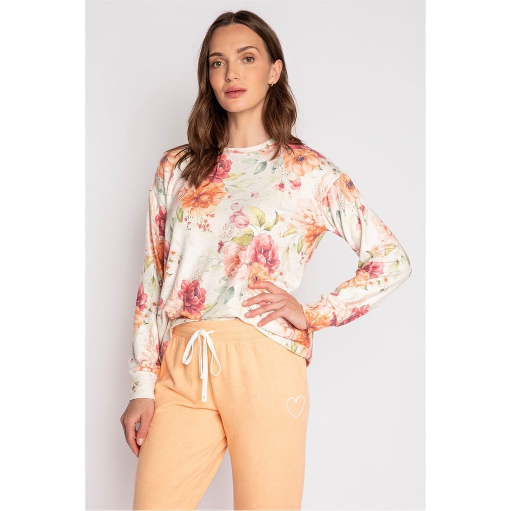 Pink and orange floral print long sleeve crew neck top on peachy jersey fabric.