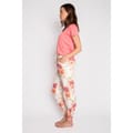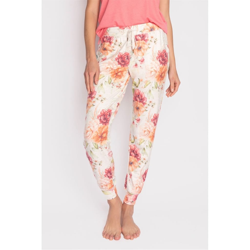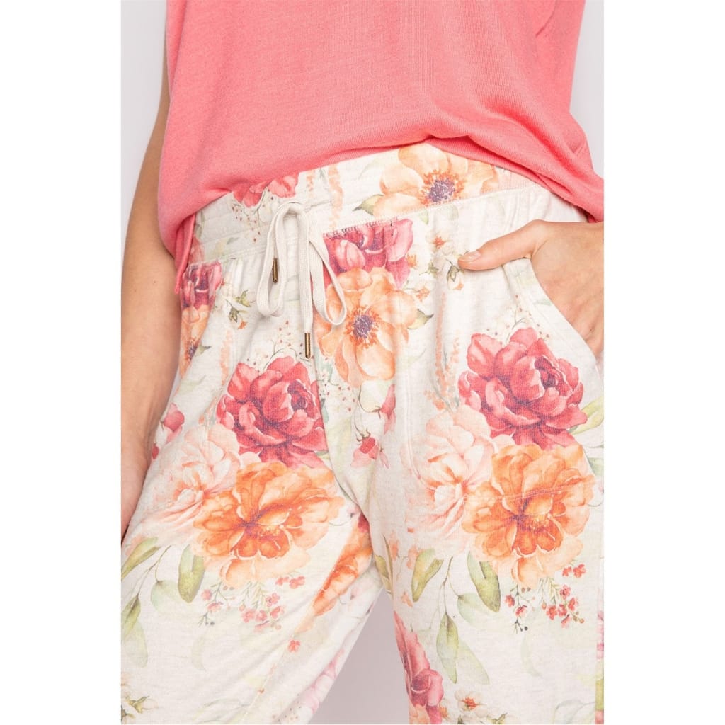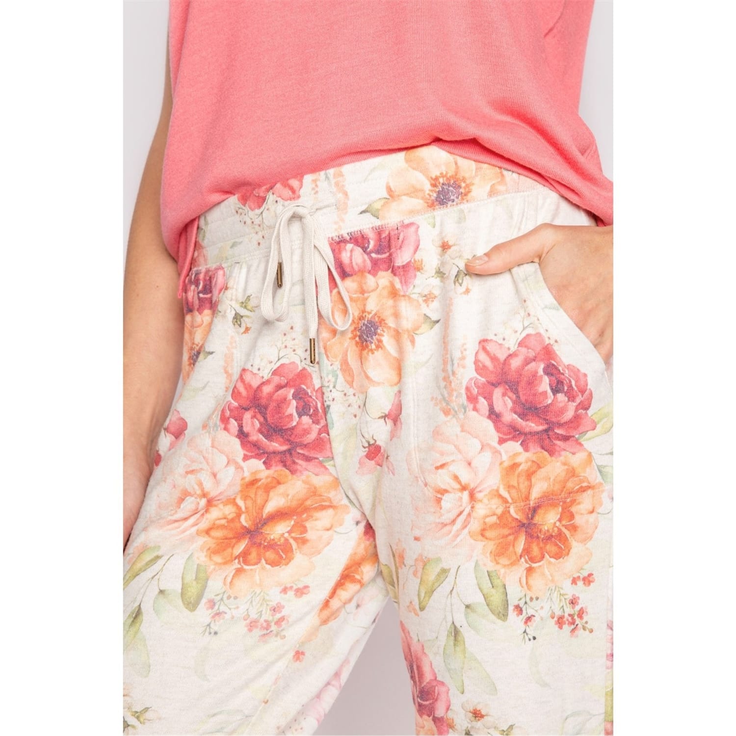 Pink and orange floral print banded jogger pant on peachy jersey fabric with pockets and tie waist.