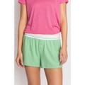 Hot pink lounge short on peach jersey fabric with faux snap fly and rainbow heart waistband.