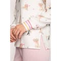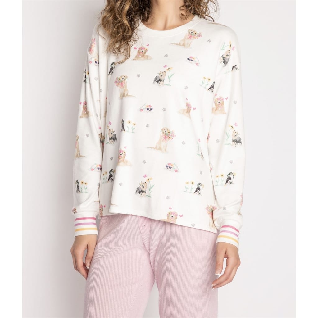 Ivory long sleeve crew neck top with dog & flower print on peachy jersey fabric with side slits.