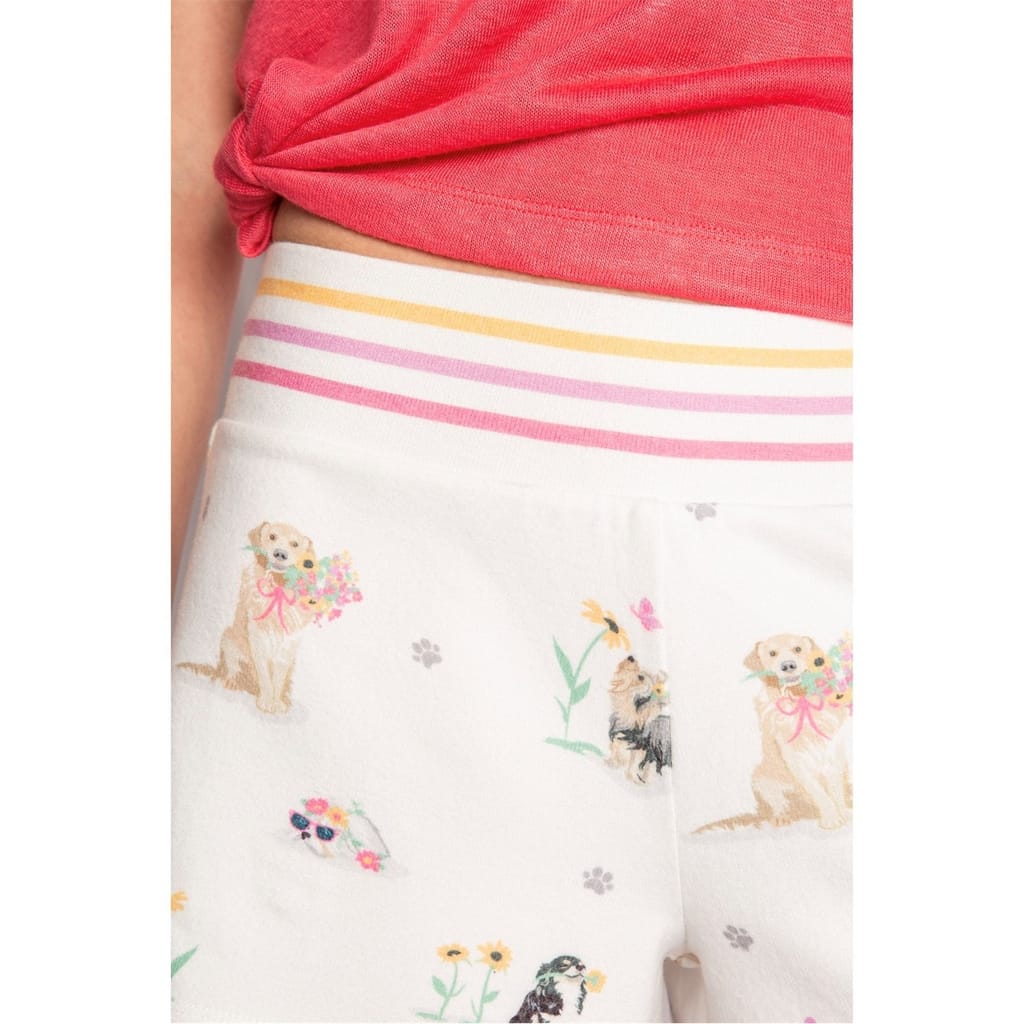 Ivory lounge short with dog & flower print on peachy jersey fabric. Includes striped waistband.