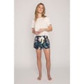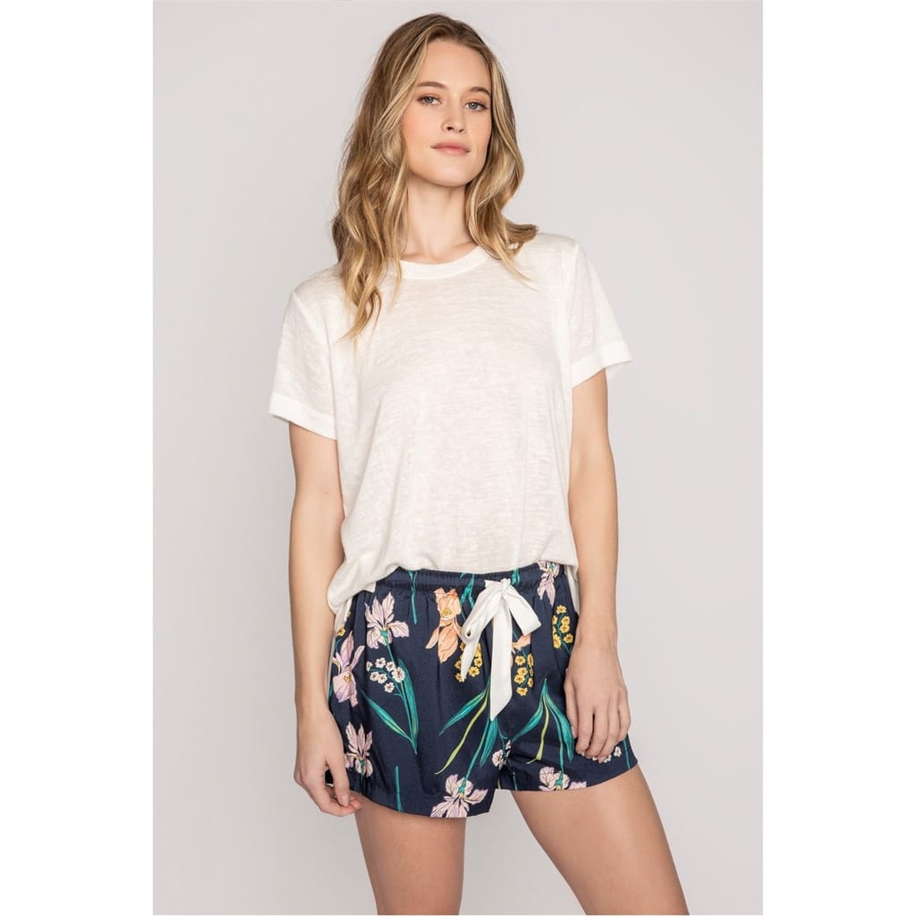 Woven navy lounge short in floral lily print with smooth satin back and tie waist.