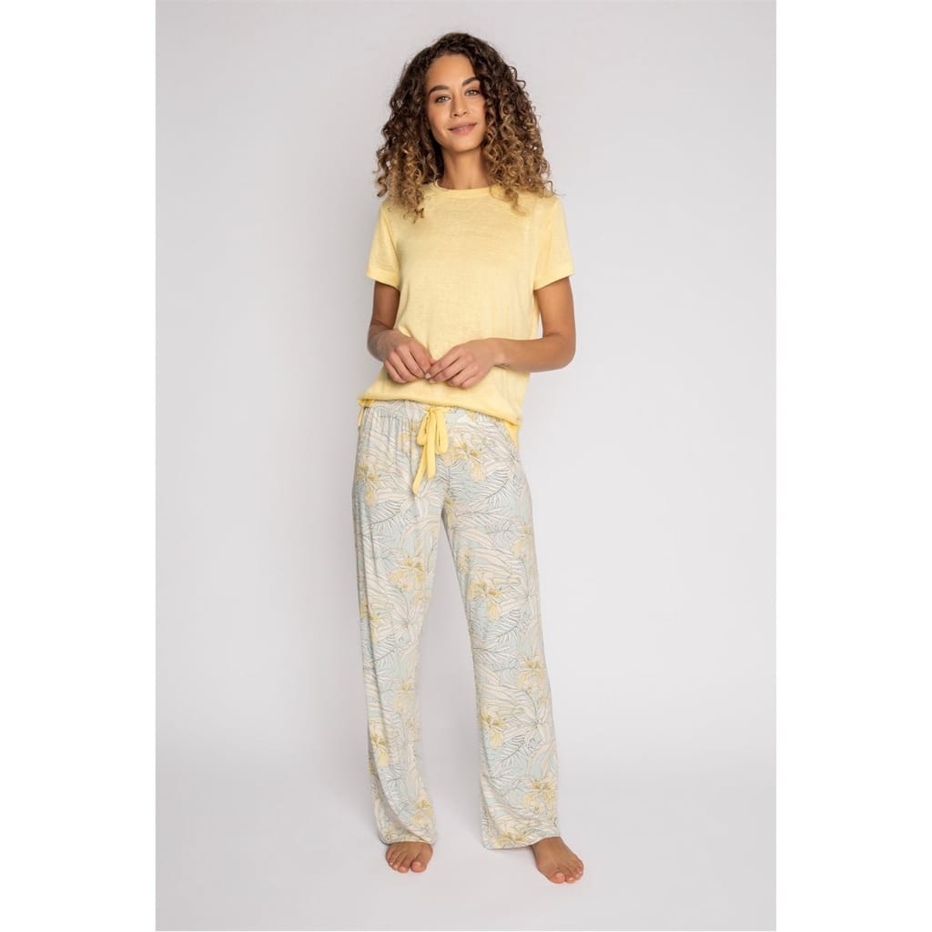 Stay cool and comfortable in these lounge shorts, designed in a muted seafoam-and-yellow bird-palm print on soft aloe-infused fabric. With a relaxed fit and tie waist, they bring an easy blend of laid-back comfort and subtle tropical charm. -
