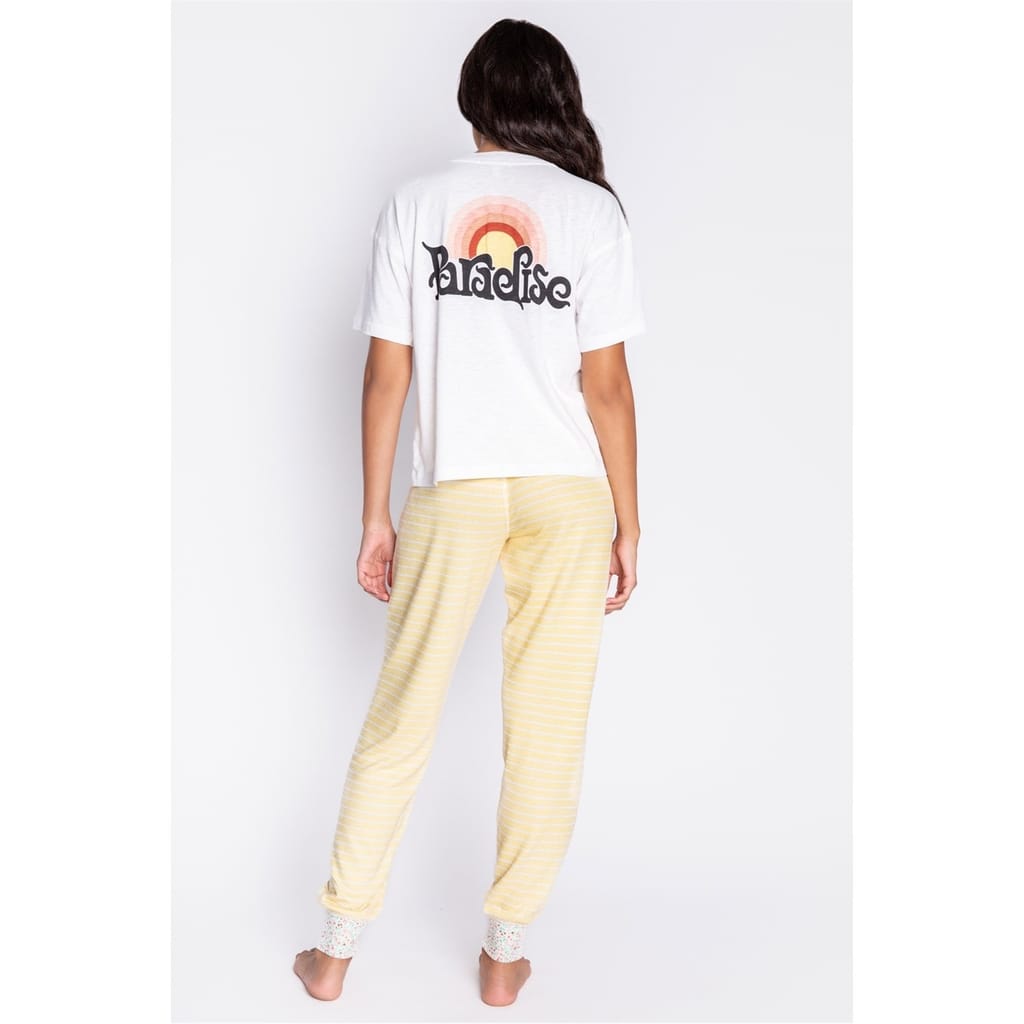 Bring a pop of colour to your everyday with this ivory short-sleeve tee, crafted in soft modal jersey and finished with a bold rainbow Paradise graphic on the front. Light, playful, and easy to wear — it’s a feel-good staple made for relaxed days. -