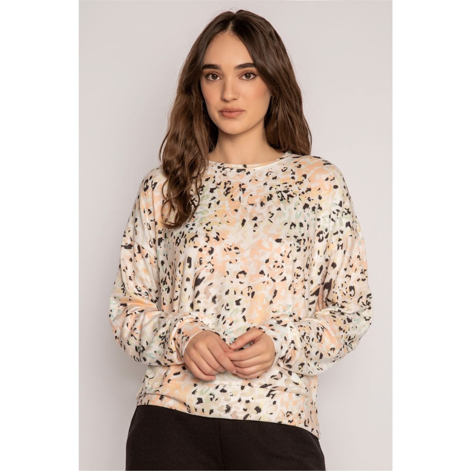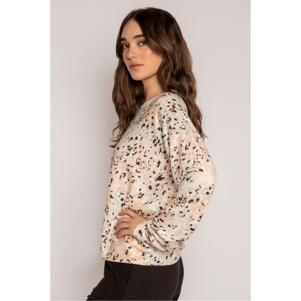 Fierce meets cosy in this long-sleeve PJ top, crafted from buttery-soft jersey and covered in a coral, ivory, and black leopard print. Finished with a banded hem, it’s the perfect mix of playful edge and everyday comfort — a standout piece for your lounge wardrobe. -