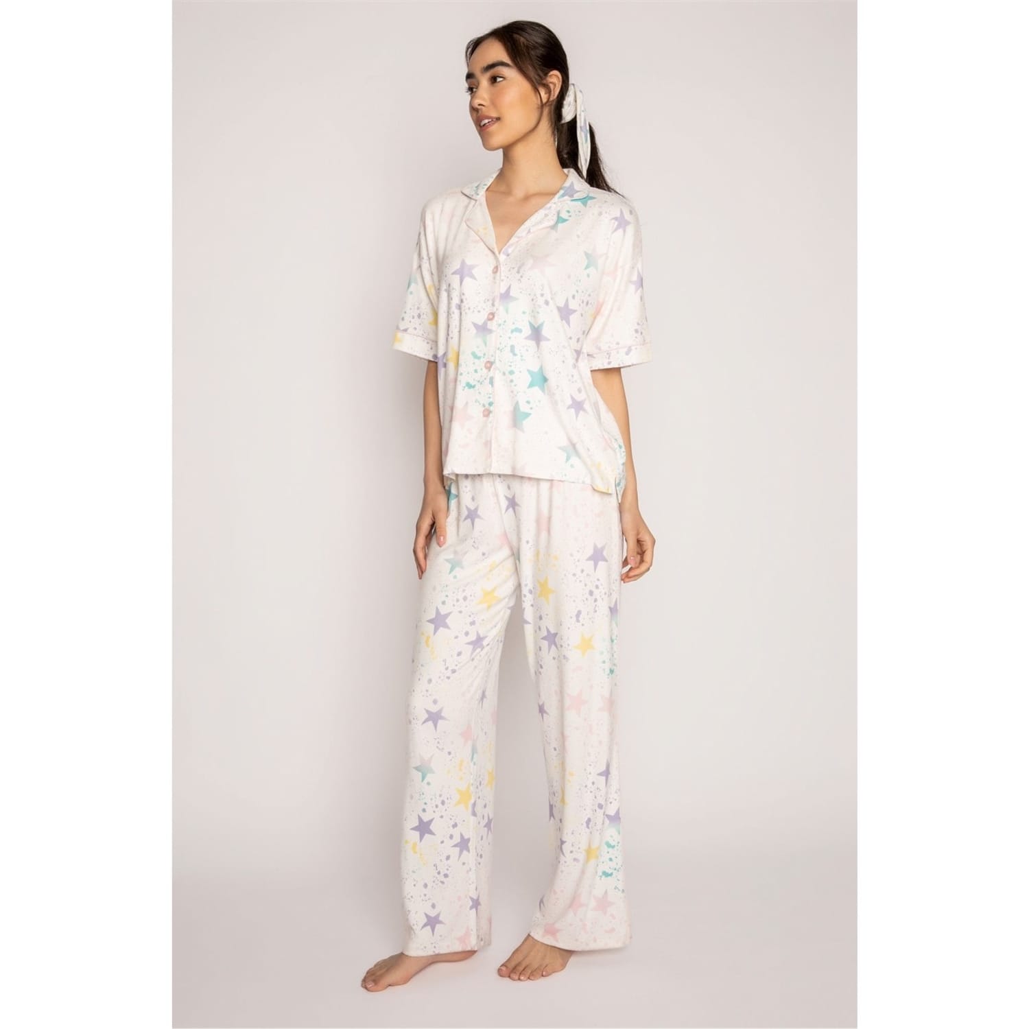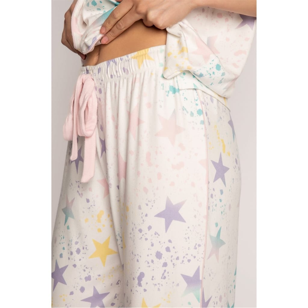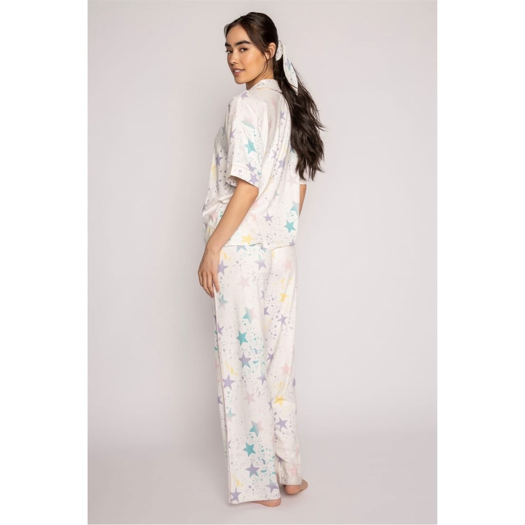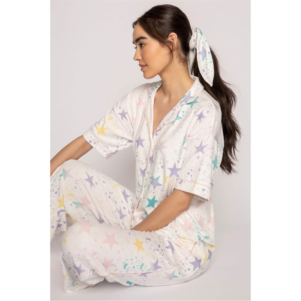 Soft, dreamy, and full of charm. This three-piece pyjama set is crafted from ultra-soft brushed pointelle in a creamy ivory hue with a delicate colourful star print. The relaxed short-sleeve button-down shirt pairs perfectly with matching pull-on pants, both finished with piped trim. A matching tie headband tops it off—perfect for gifting or treating yourself. -