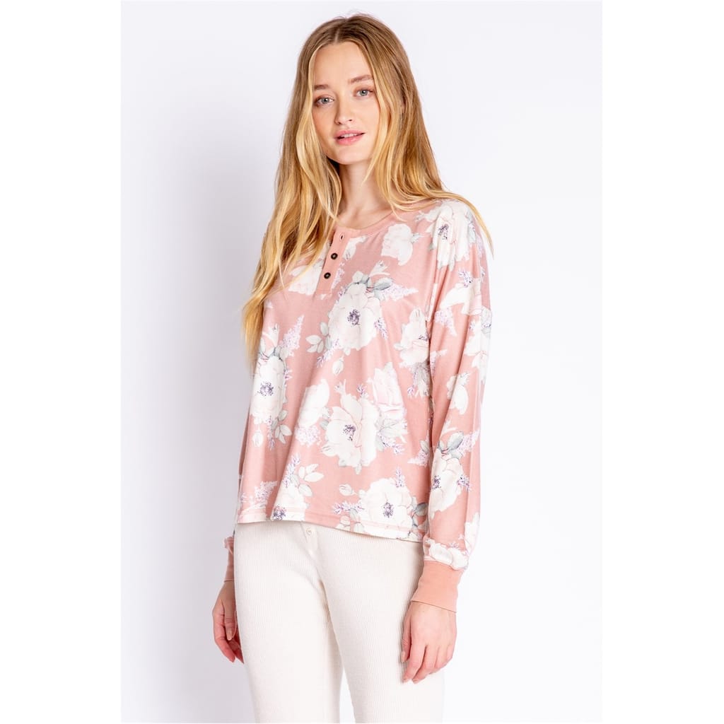 Bring a soft, seasonal touch to your wardrobe with this peachy crew neck, printed in delicately bright watercolour florals. Designed with a flattering banded hem and chic split cuff detail, it’s an easy piece that balances comfort and elegance for everyday wear. Button up crew neck top, -