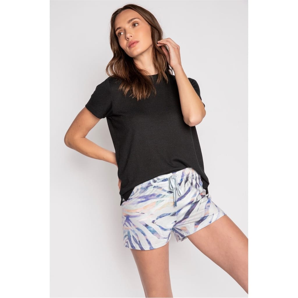 Lounge shorts with colourful print on peachy jersey fabric. Includes Drawstring fastenings.