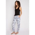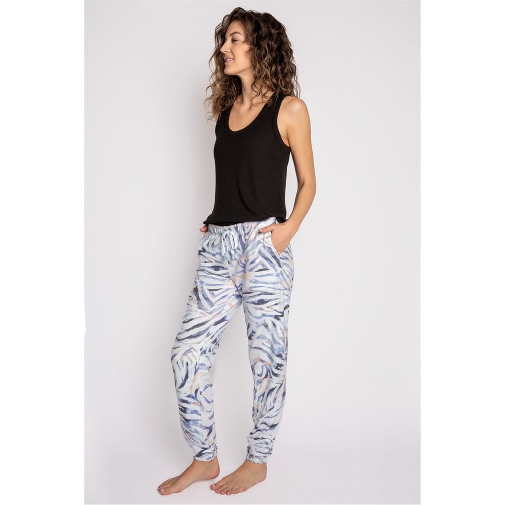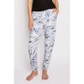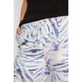 Banded jogger pant with colourful print on peachy jersey fabric with tie waist & pockets.
