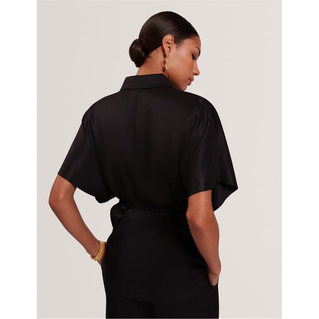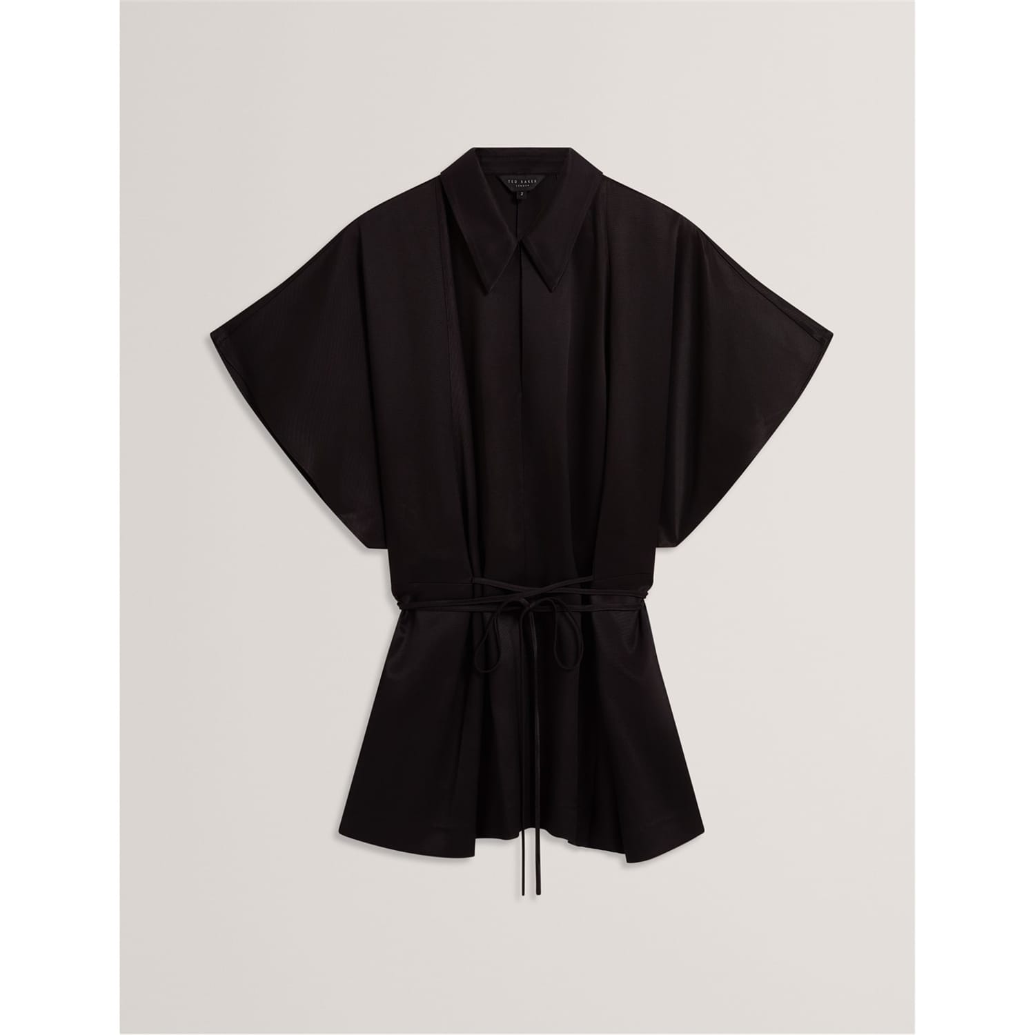 This Ted Baker top features a solid pattern with short sleeves and a unique kimono sleeve style. It includes a drawstring closure and a shirt collar, offering an adjustable fit. The design is completed with a straight hem and a practical waist pocket, making it a versatile addition to your wardrobe. -