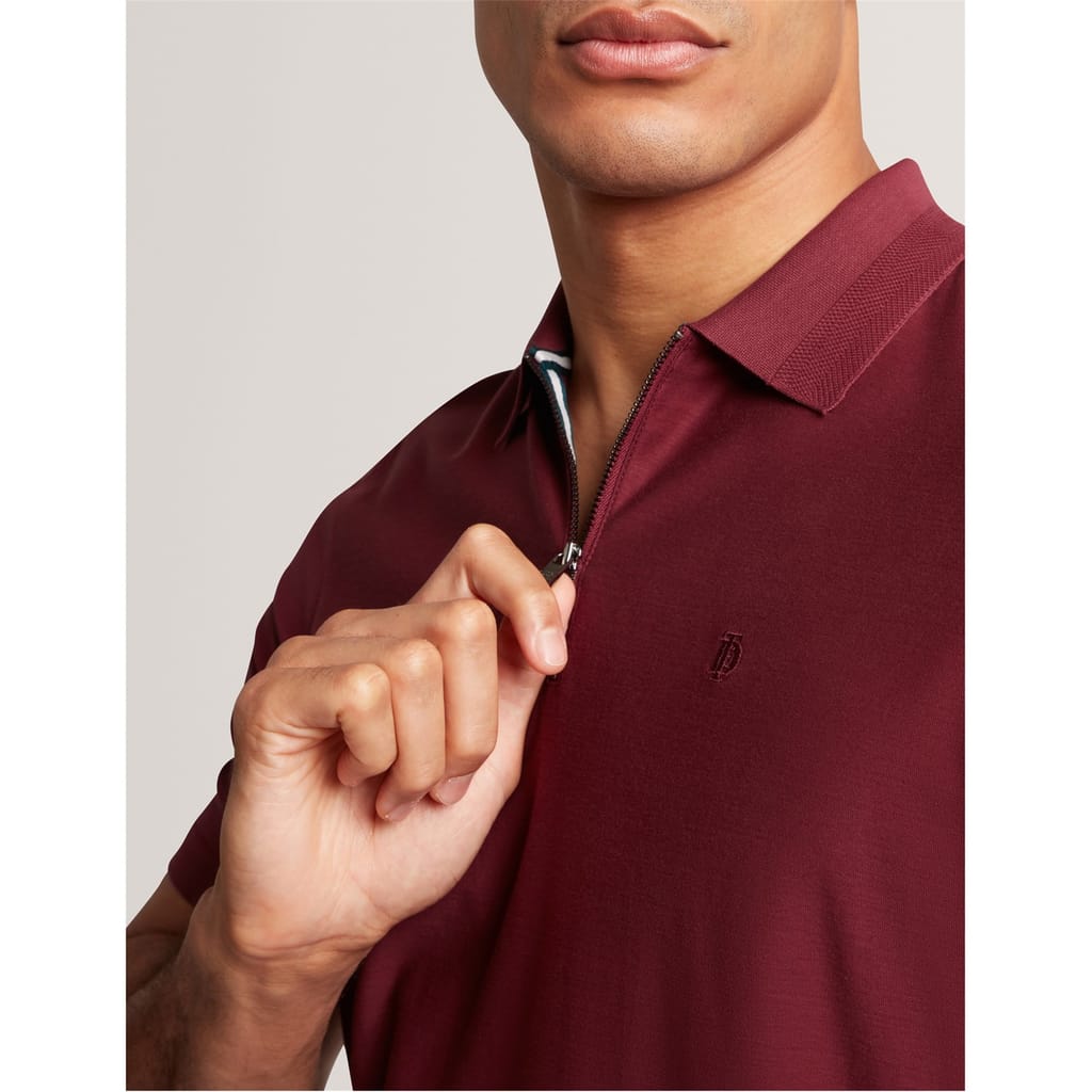 Discover the Ted Baker top, featuring a textured and solid design. This short-sleeve piece offers a regular fit with a polo collar and a straight hem. The top is enhanced with an embroidered logo and a convenient zipper closure, making it a stylish addition to your wardrobe. -