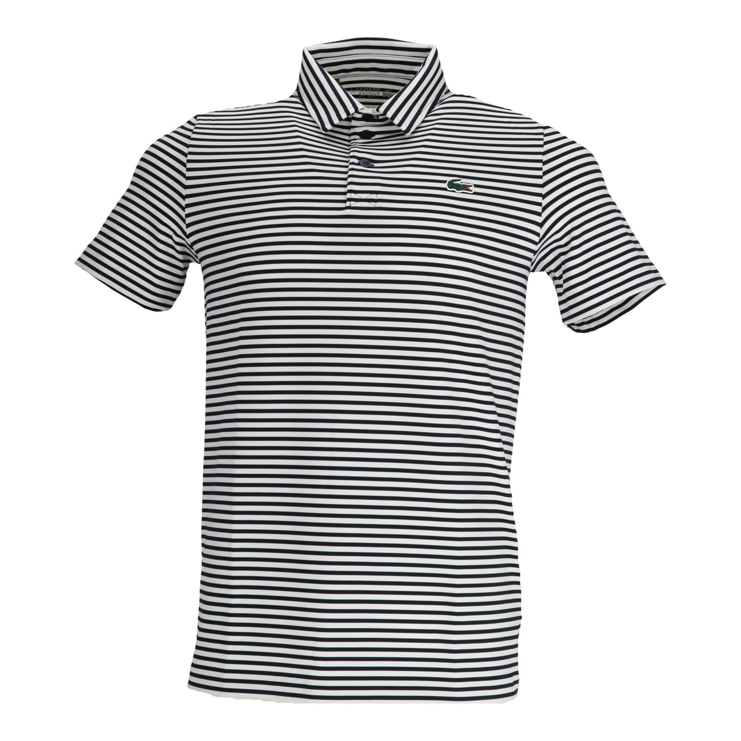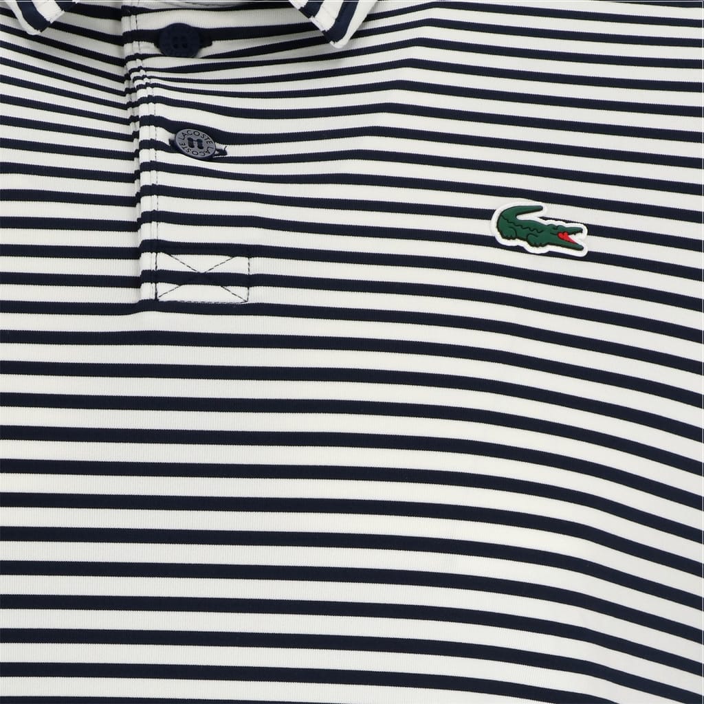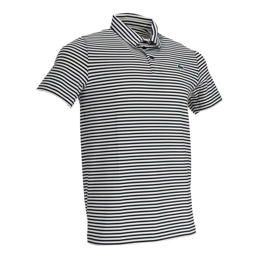 This Lacoste top features a classic polo collar and a front button closure, offering a regular fit. The short sleeves and horizontal stripe pattern add a touch of style to this performance piece, making it a versatile addition to your wardrobe. -