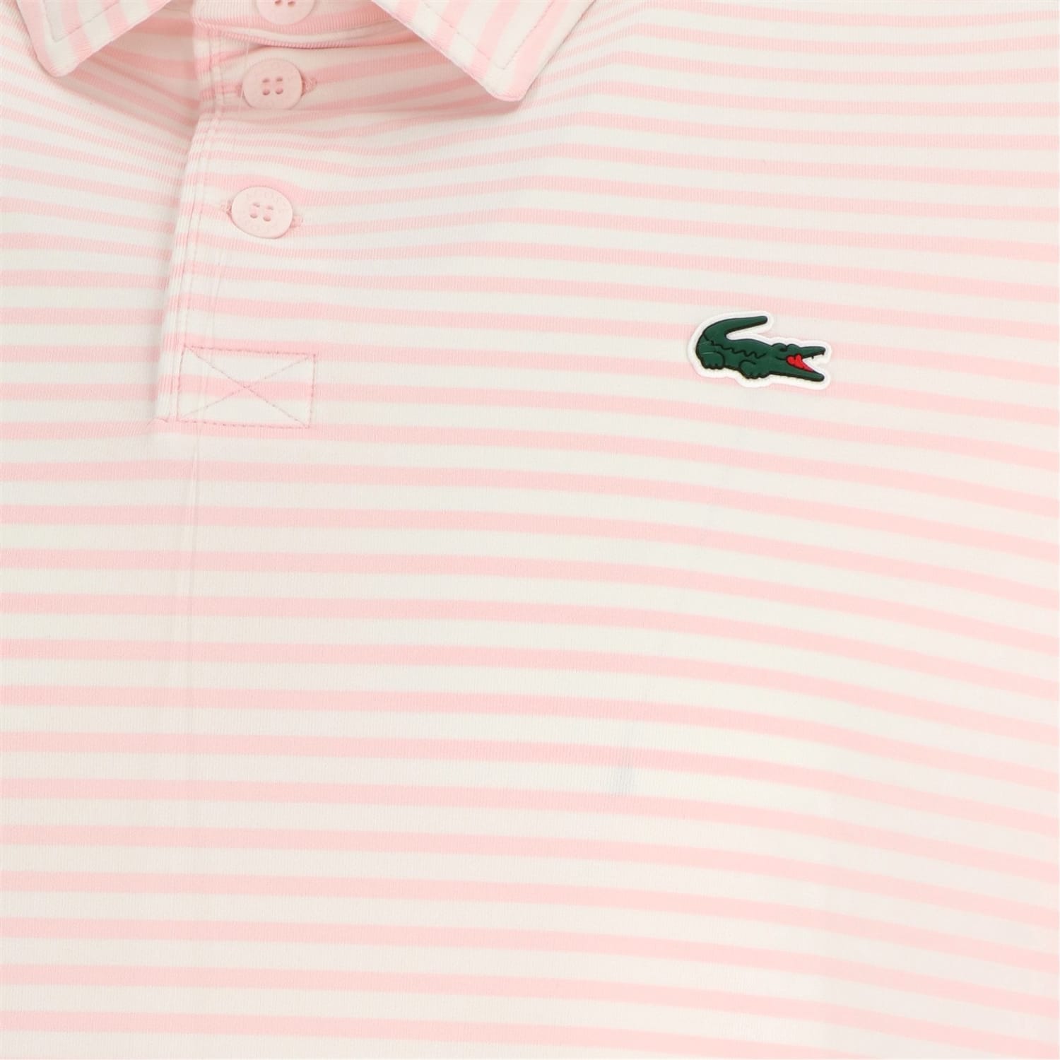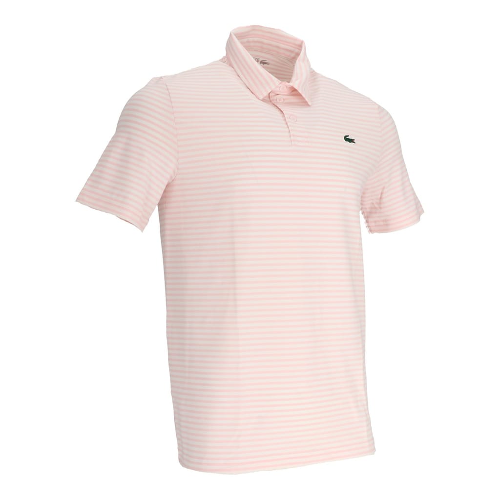 This Lacoste top is designed for performance with a regular fit and short sleeves, perfect for summer. It features a polo collar and a front button closure, complemented by a horizontal stripe pattern. The iconic crocodile logo adds a distinctive touch to this piece. -