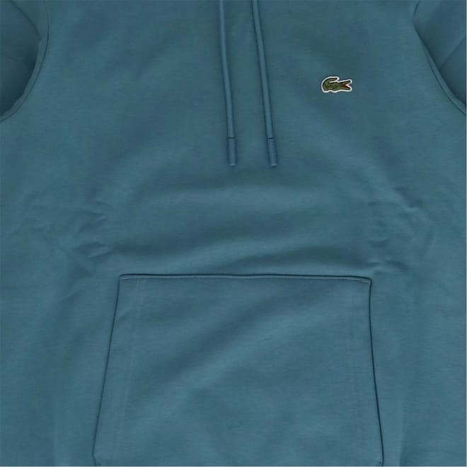 This Lacoste top features a hooded neck and long sleeves, offering a regular fit. The solid pattern is complemented by a kangaroo pocket and a distinctive crocodile logo. The ribbed cuffs add a touch of detail, while the drawstring closure ensures a comfortable fit. The crocodile print enhances the overall design, making it a stylish choice for casual wear. -