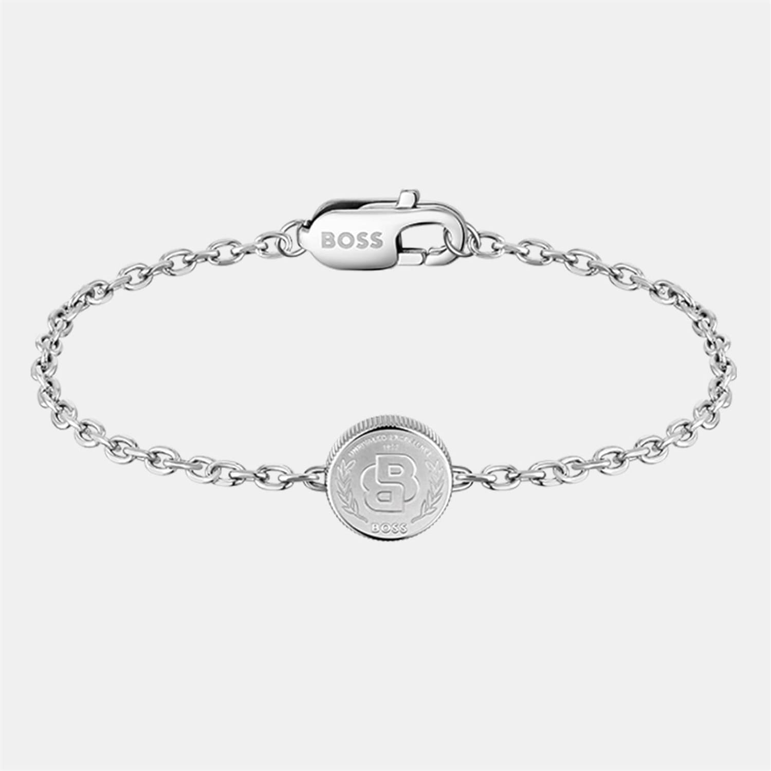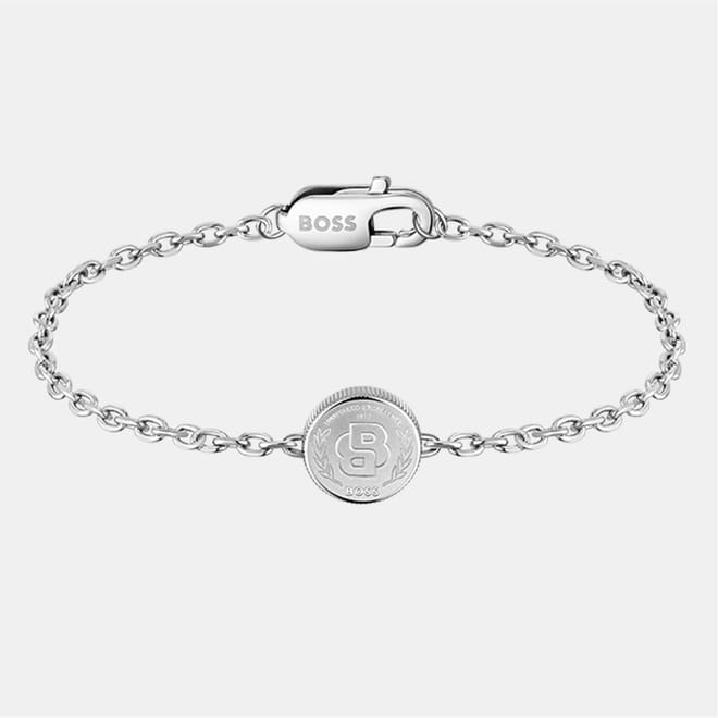 - Bracelet featuring a stainless steel chain and medallion pendant with etched Double B design element resembling a coin. Length 190mm with 12mm pendant. -