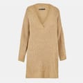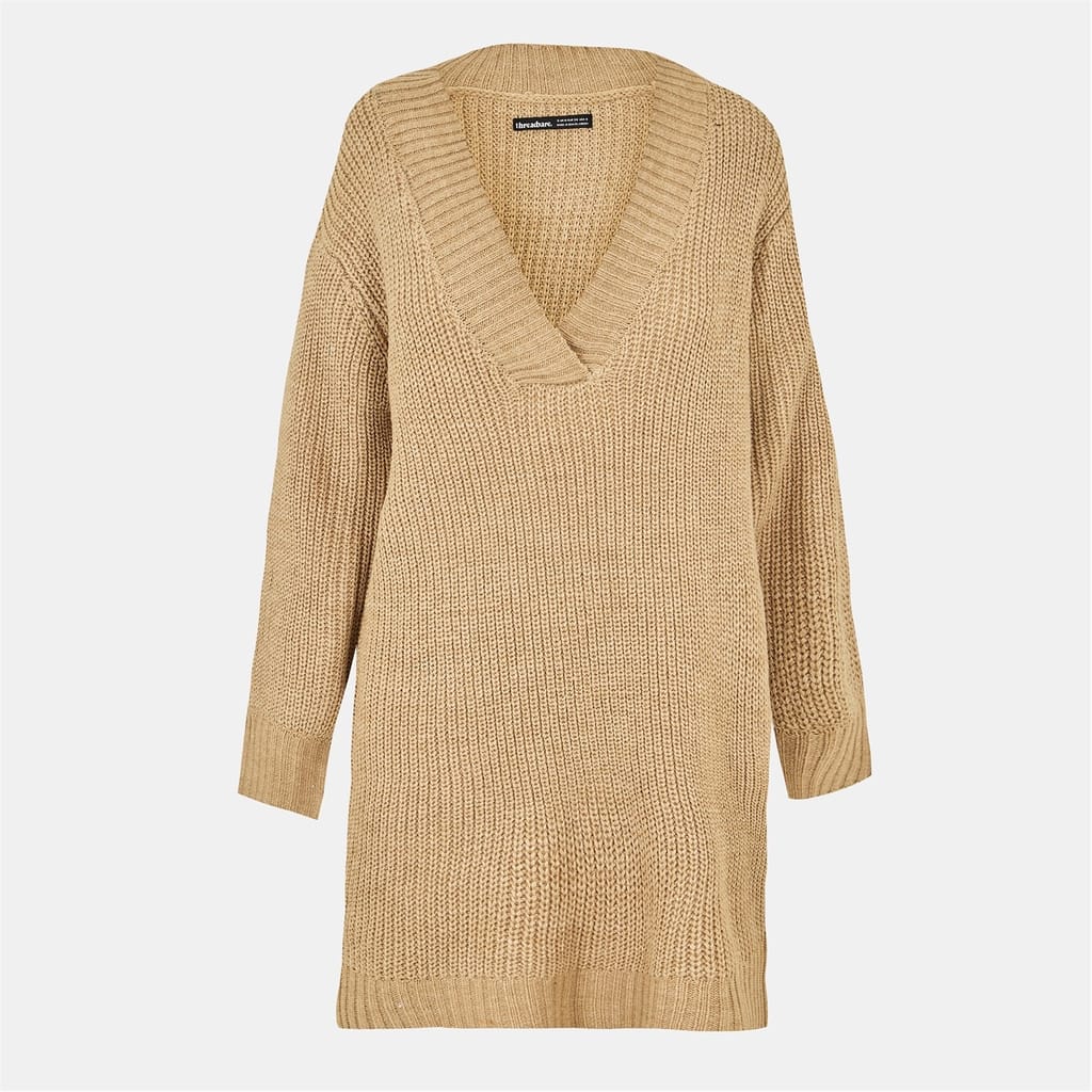 This Threadbare mini sweater dress features a textured design with a v-neck and long sleeves. The drop shoulder adds a relaxed touch, while the ribbed hem provides a neat finish. Perfect for those seeking a stylish yet comfortable option for cooler days. -