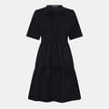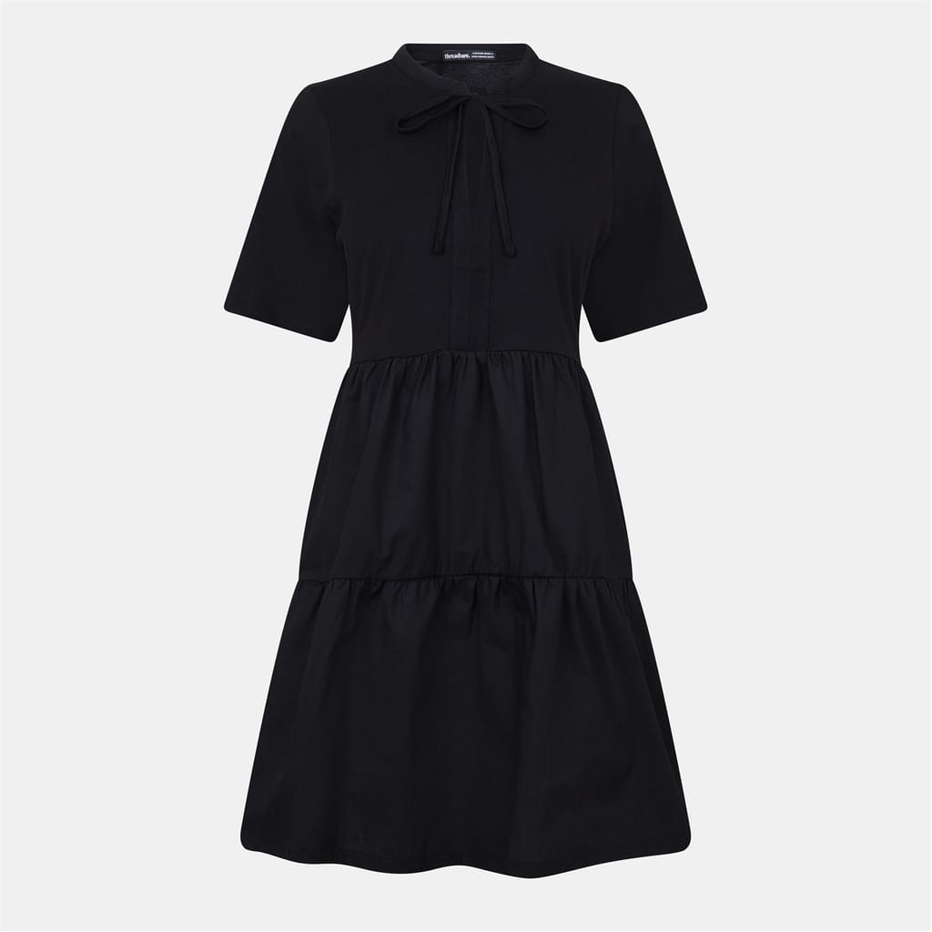 Discover the Threadbare tiered dress, a knee-length piece featuring a band collar and a tie neck. This solid dress offers a regular fit with short sleeves and a straight hem, perfect for a versatile wardrobe addition. -