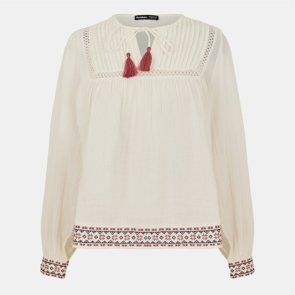 Discover the Threadbare top, featuring a tie neck and long peasant sleeves with elasticated cuffs. Designed with a relaxed fit, this piece offers both comfort and style. Perfect for those seeking a versatile addition to their wardrobe. -