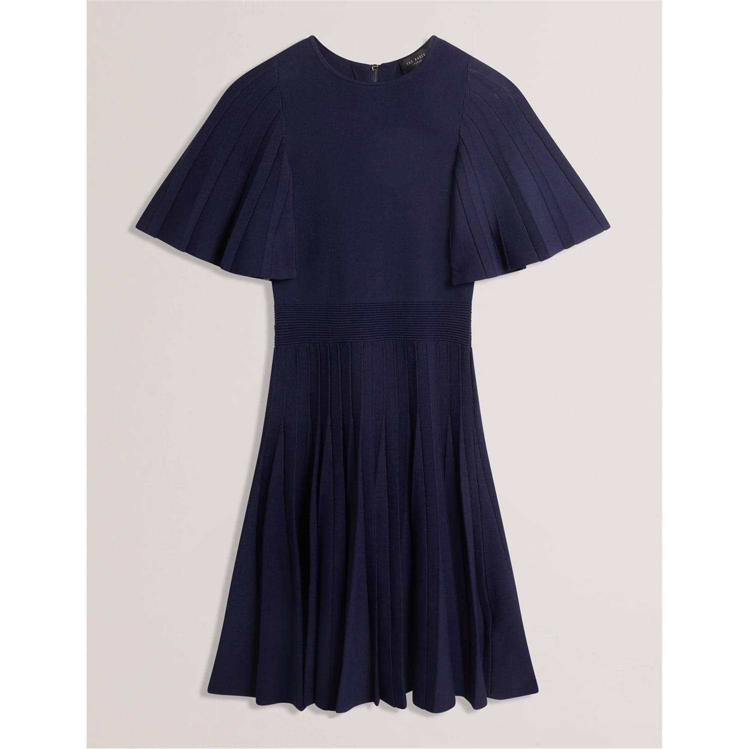 This Ted Baker skater dress is a stylish addition to your wardrobe. Crafted from knit material, it features a ribbed pattern and a mini length. The dress is designed with a crew neck and cape sleeves, offering a unique silhouette. Its straight hem and regular fit ensure a comfortable and flattering look. -