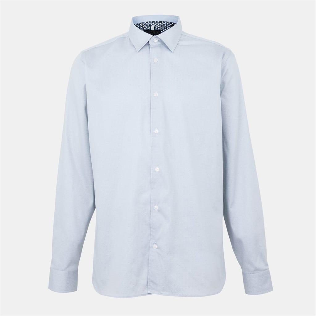 This Ted Baker top features a geometric pattern, adding a touch of sophistication to your wardrobe. Designed with long sleeves and a regular fit, it offers comfort and style. The button closure and point collar enhance its formal appeal, while the barrel cuff adds a refined finish. A subtle logo embellishment completes the look, making it a perfect choice for formal occasions. -