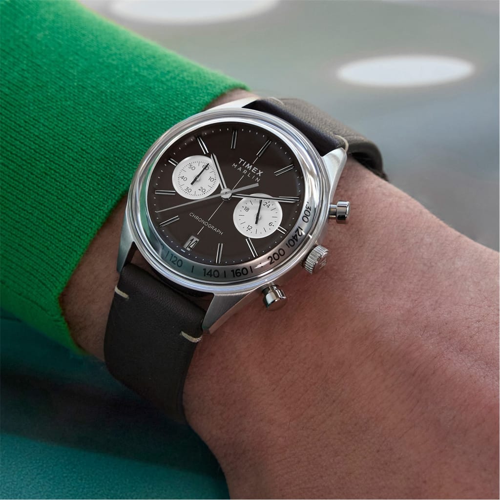 This wrist watch features a classic analogue display, complemented by a single wrap leather strap. It is water-resistant up to 50m, making it suitable for various conditions while maintaining its elegant design. -