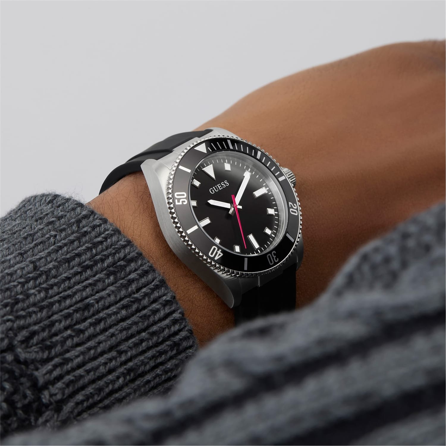 Discover the elegance of Guess with this wrist watch, featuring a sleek black dial and a durable rubber strap. The analogue display adds a classic touch to this timepiece, making it a stylish addition to any collection. -