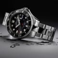 This wrist watch features a sleek black dial and a durable steel bracelet strap, offering a classic and timeless look. With an analogue display, it combines traditional style with modern functionality. The watch is water-resistant up to 300m, making it suitable for various activities while ensuring reliability and performance. -