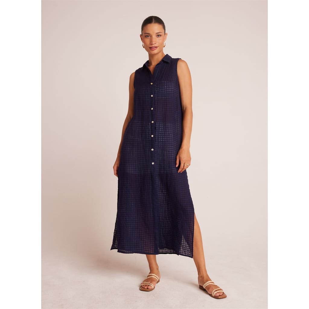 This Bella Dahl shirt dress is a stylish midi piece featuring a gingham pattern. It boasts a collared neck with a shirt collar and a button closure, adding a classic touch. The dress is designed with a straight hem and side slit embellishments, offering a modern twist to the traditional shirt dress style. -