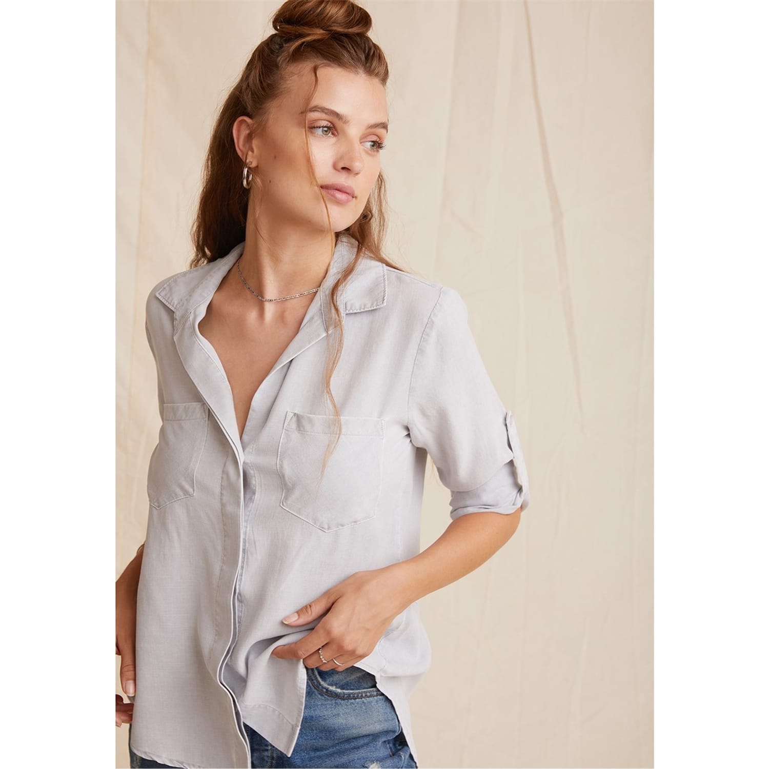 Discover the Bella Dahl top, a perfect blend of casual style and functionality. This solid long-sleeve piece features a relaxed fit with a button closure and a shirt collar. The button-tab sleeves and roll-up cuffs add versatility, while the back slit and pocket embellishments enhance its practicality. Ideal for a laid-back yet polished look. -