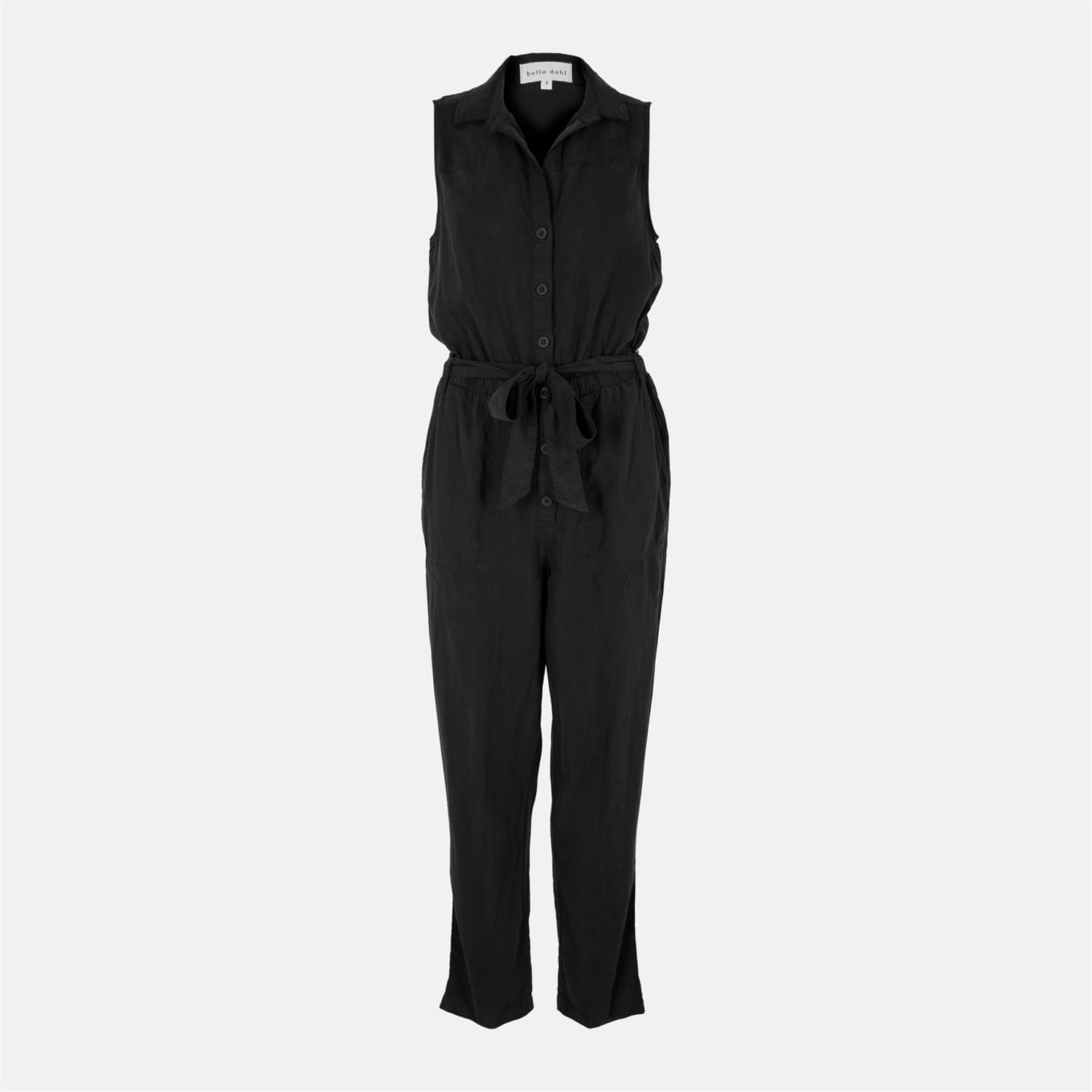 Discover the Bella Dahl jumpsuit, featuring a collared neck and a relaxed fit for effortless style. This sleeveless design is enhanced with practical pockets and a versatile belt closure, complemented by buttons and a tie waist for a customisable fit. Perfect for those seeking a blend of comfort and functionality. -