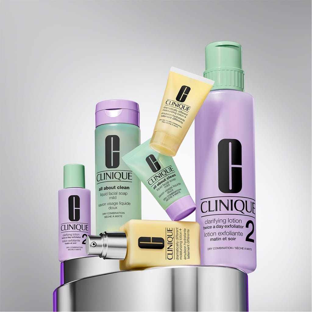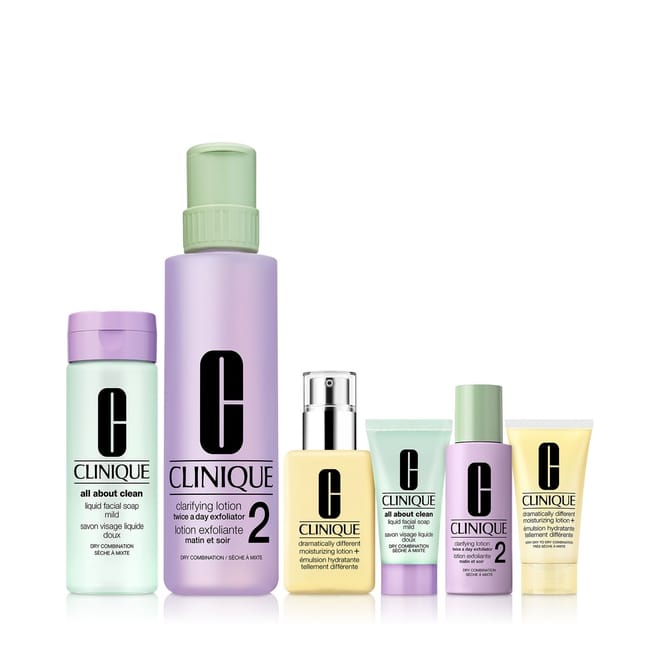 - Clinique’s signature 3-Step Skin Care System for healthy-looking skin—one set for home, one for travel. Customised for drier skin types.