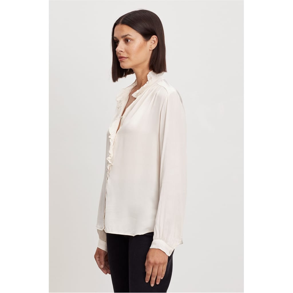 This Velvet by Graham & Spencer top features a regular fit with a v-neck and long ruffle sleeves. The solid pattern adds a classic touch, while the button closure and fitted cuffs provide a refined finish. The ruffle embellishments enhance its elegant design, making it a versatile addition to any wardrobe. -