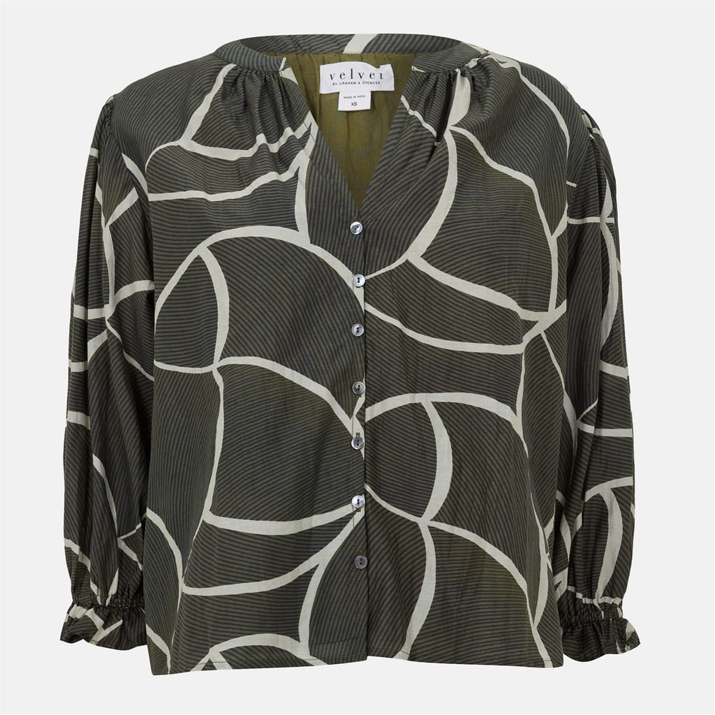 Discover the Velvet by Graham & Spencer top, a perfect addition to your casual collection. This regular fit piece features a geometric pattern and a v-neckline, complemented by long bishop sleeves with elasticated cuffs. The button closure adds a touch of elegance, making it a versatile choice for any occasion. -