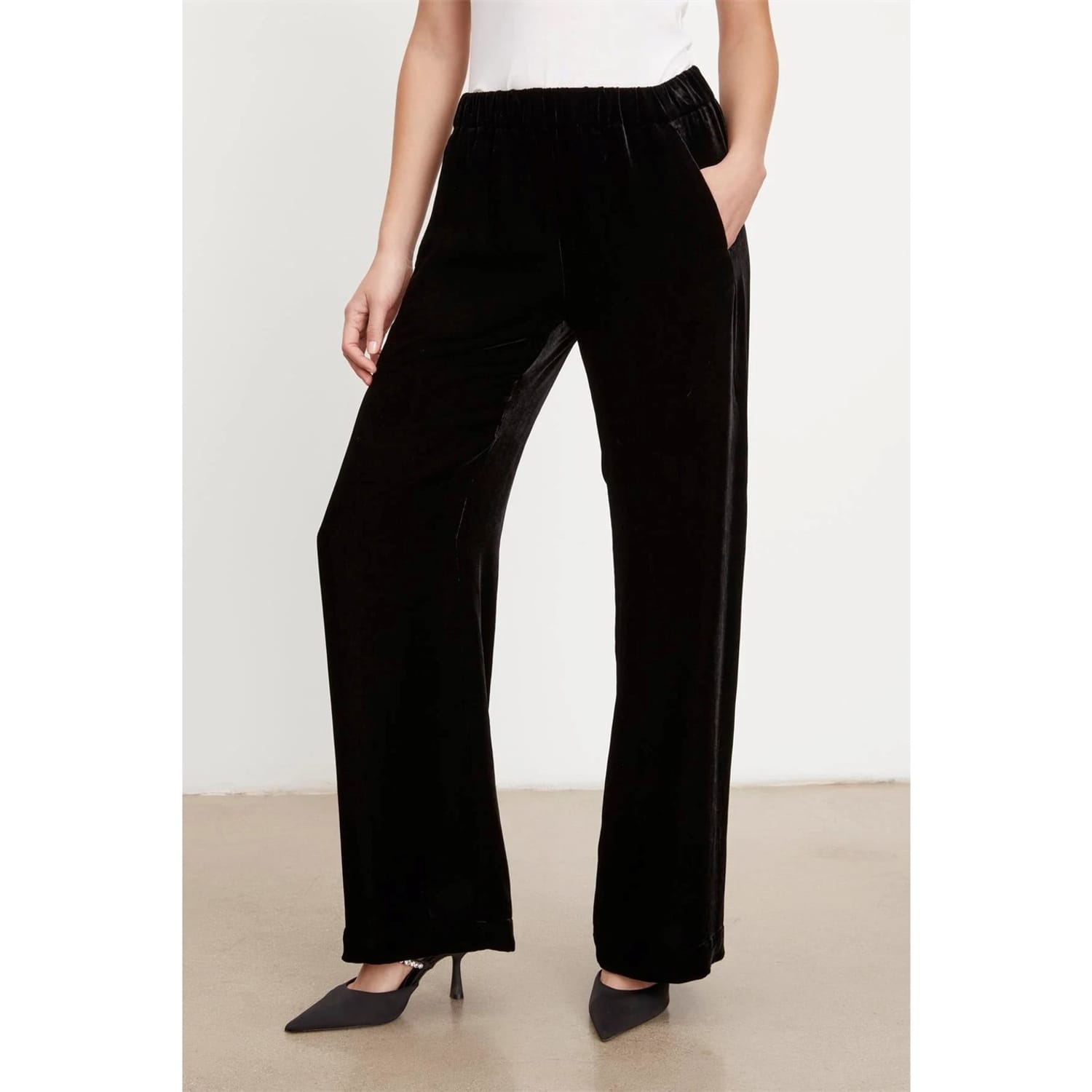 Discover the tailored elegance of Velvet by Graham & Spencer trousers. These wide-leg pants feature an elasticated waistband for comfort and a stylish fit. The addition of pockets enhances their practicality, making them a versatile choice for any wardrobe. -