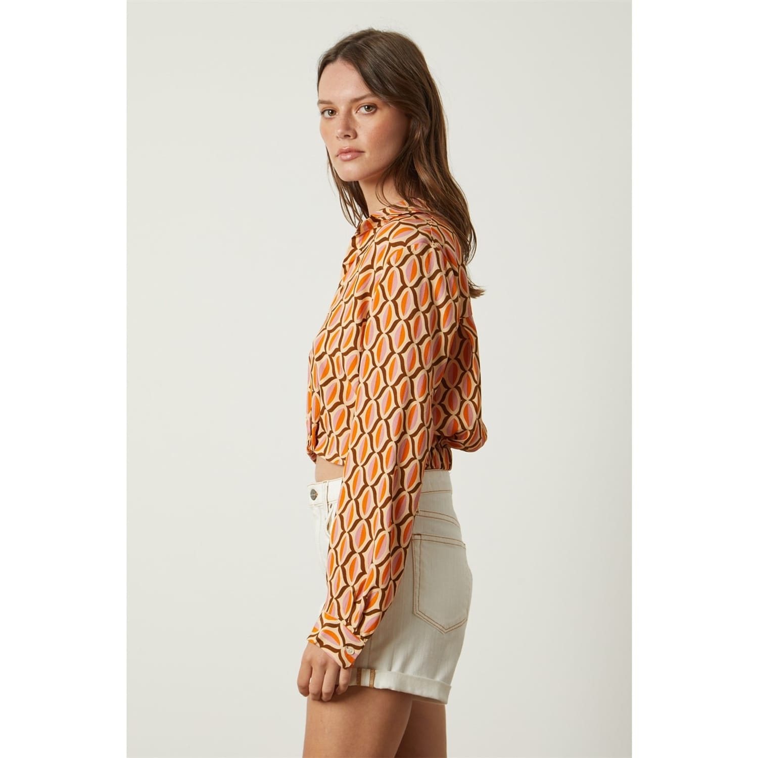 Discover the Velvet by Graham & Spencer top, featuring a geometric pattern and a cropped length. This regular fit piece is designed with long cuff sleeves and a shirt collar, offering a casual yet stylish look. The top is adorned with a logo embellishment, adding a unique touch to its geographic print. -