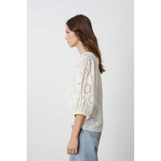 Discover the charm of Velvet by Graham & Spencer's top, featuring a regular fit and eyelet embellishments. This piece is designed with three-quarter puff sleeves and an elasticated cuff, offering a unique style. The crew neck adds a classic touch, making it a versatile addition to your wardrobe. -