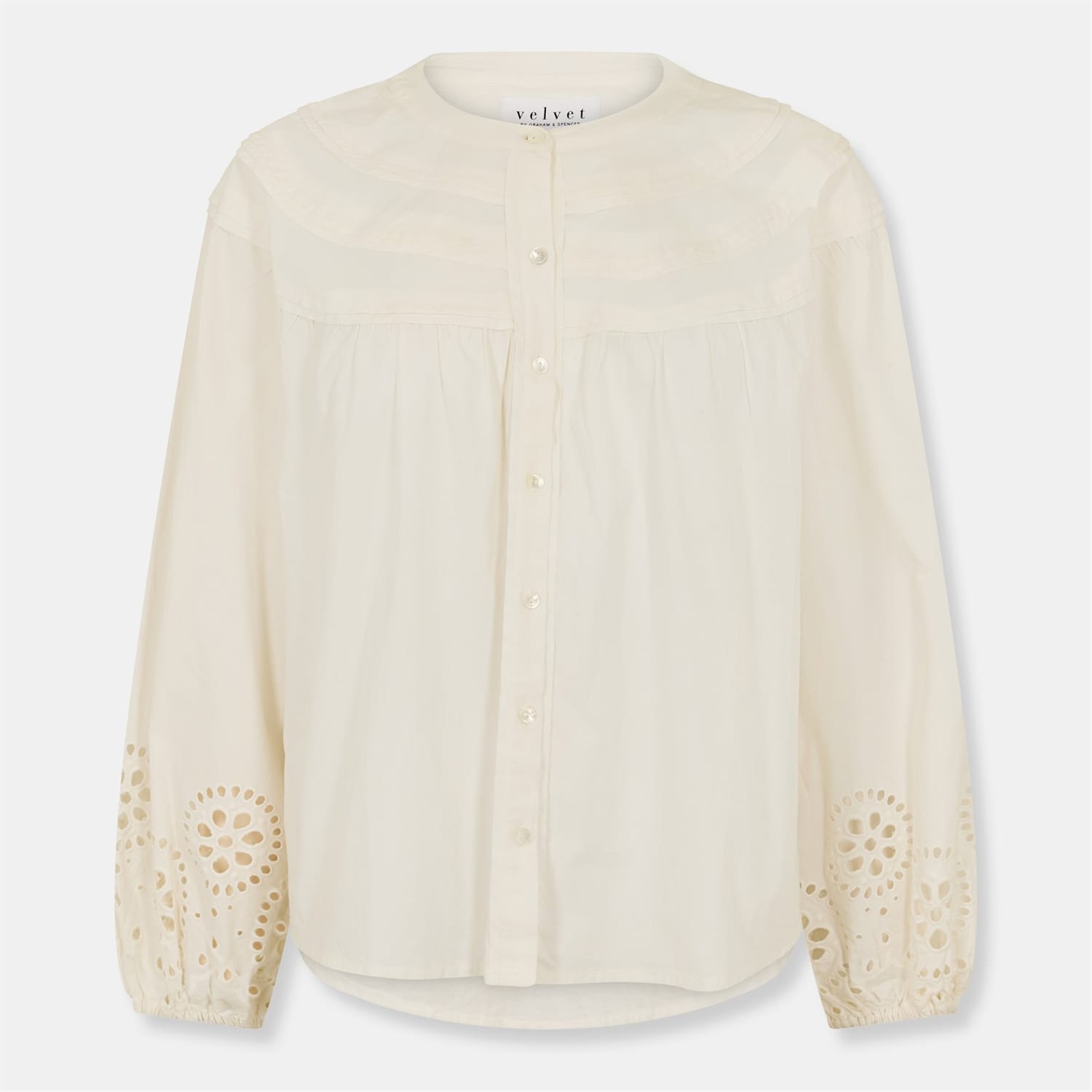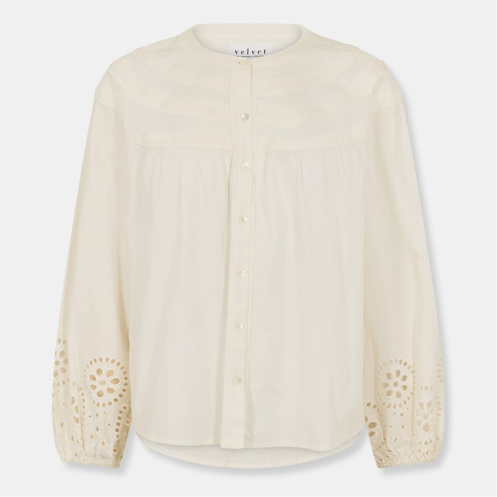 Discover the elegance of Velvet by Graham & Spencer's top, featuring a regular fit and long bishop sleeves with elasticated cuffs. The jewel neck and button closure add a touch of sophistication, while the solid pattern and cut-out embellishments enhance its casual appeal. Perfect for those seeking a blend of style and comfort. -