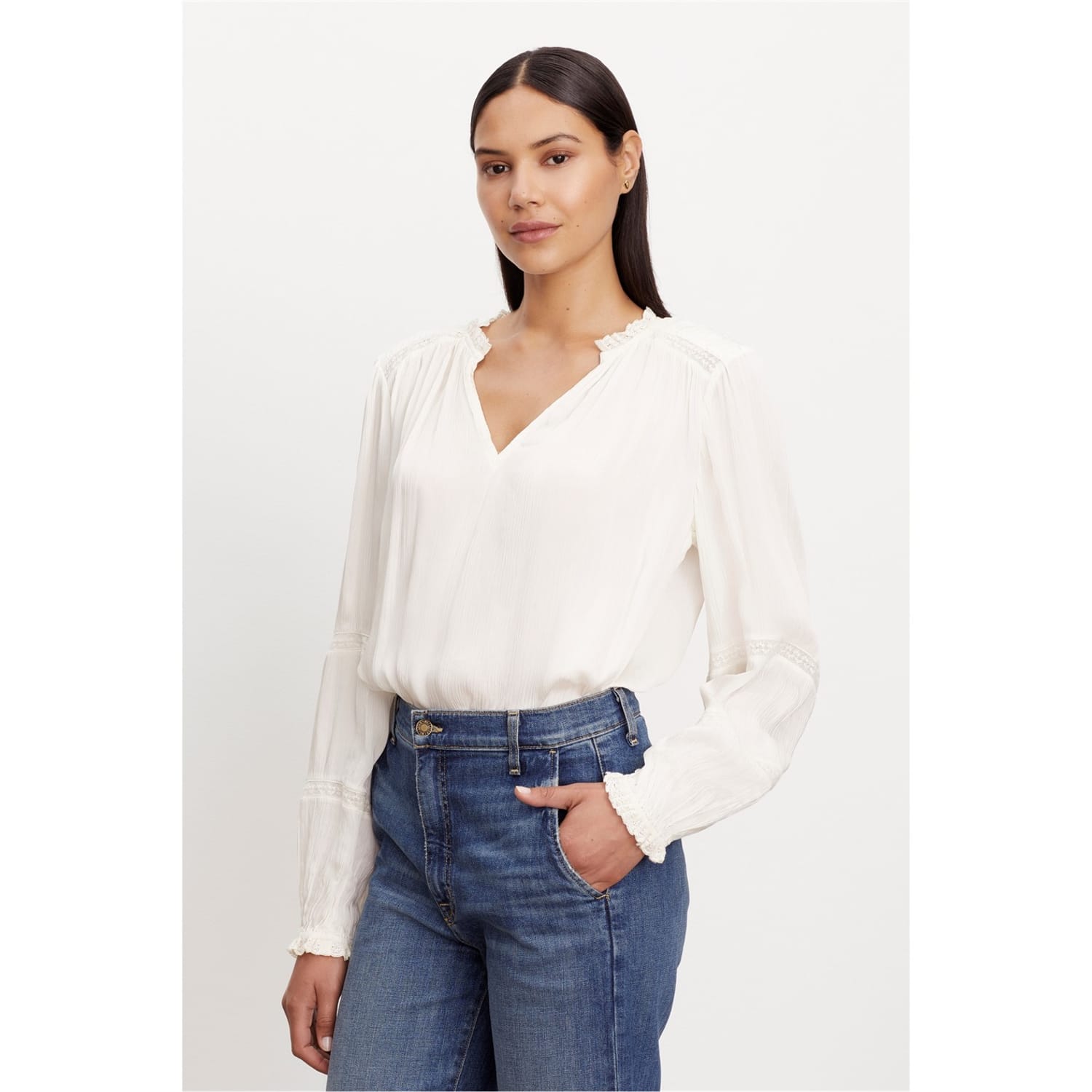 Discover the elegance of Velvet by Graham & Spencer with this regular fit top. Featuring a sophisticated V-neck and long bishop sleeves with elasticated cuffs, this solid top is adorned with delicate lace details and ruffles, adding a touch of charm to your wardrobe. -