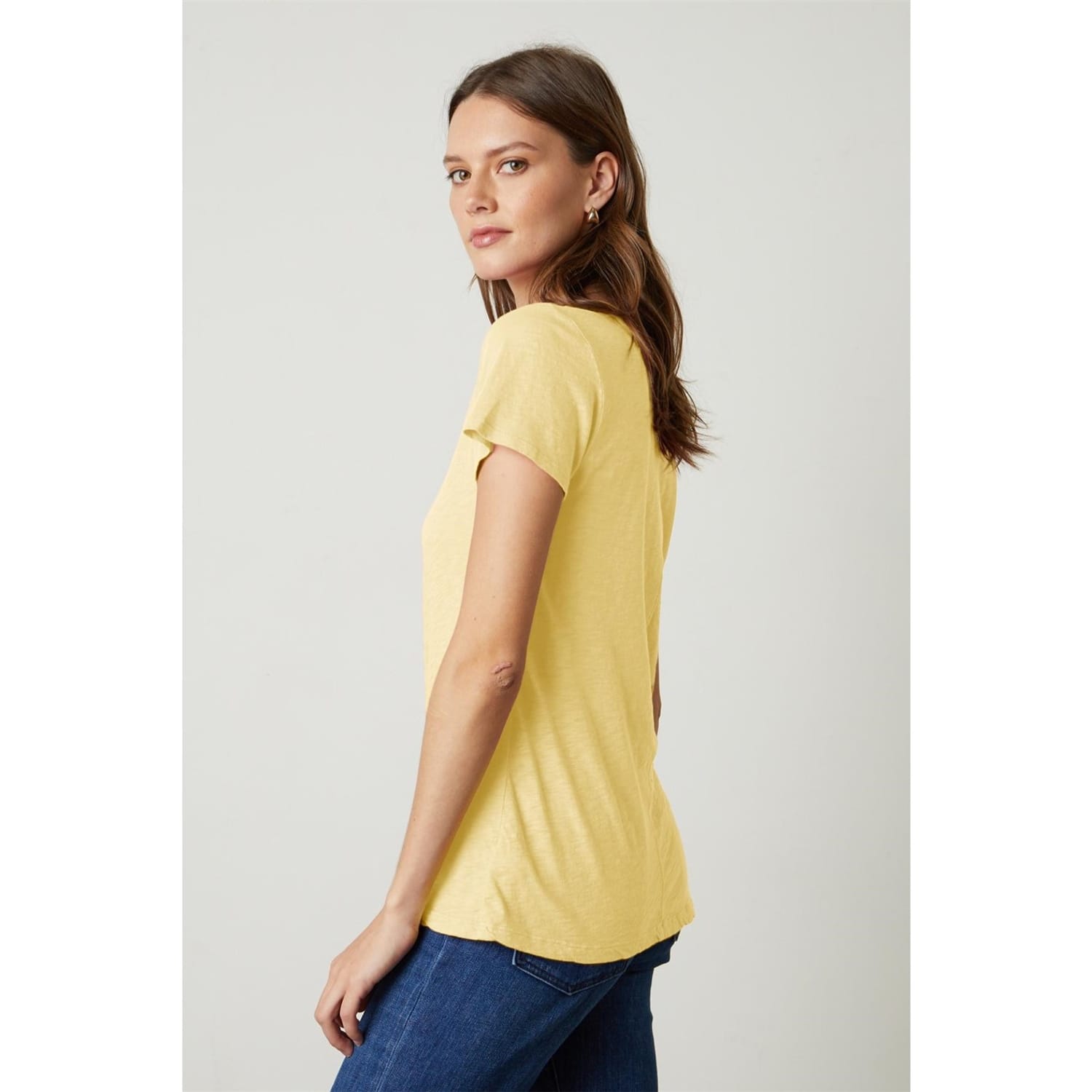 Discover the Velvet by Graham & Spencer top, featuring a regular fit and short sleeves. This solid top is designed with a classic crew neck, offering a timeless appeal. Perfect for those who appreciate simplicity and elegance in their wardrobe. -