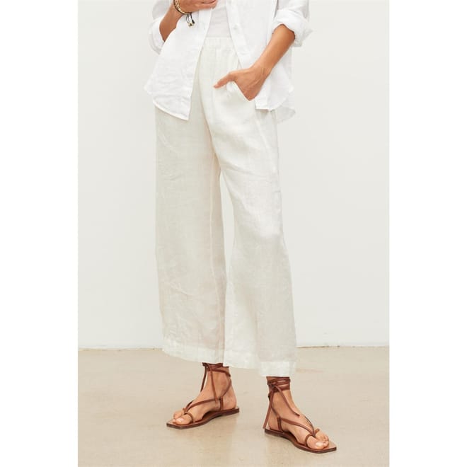 Velvet by Graham & Spencer presents tailored trousers with a wide-leg cut, offering a sophisticated silhouette. These pants feature an elasticated waistband for comfort and practicality. The addition of pockets enhances functionality, making them a versatile choice for various occasions. -