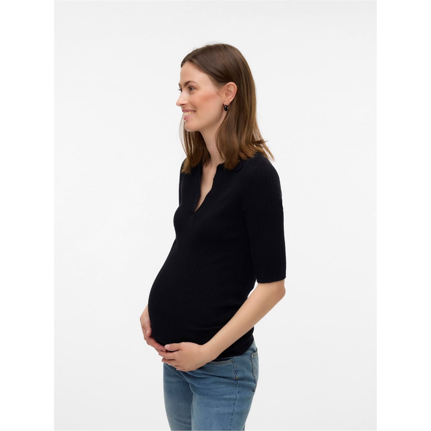 This Mamalicious top features a V-neck and three-quarter sleeves, offering a regular fit. The solid pattern adds a classic touch, making it a versatile addition to your wardrobe. -