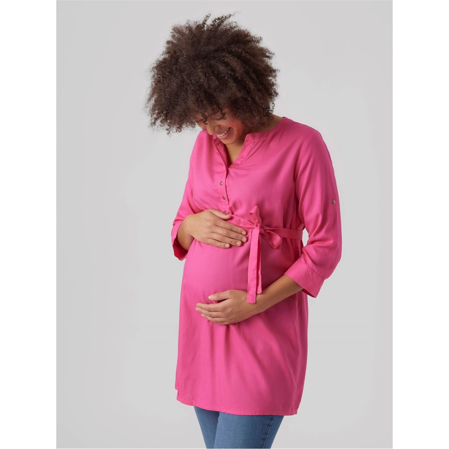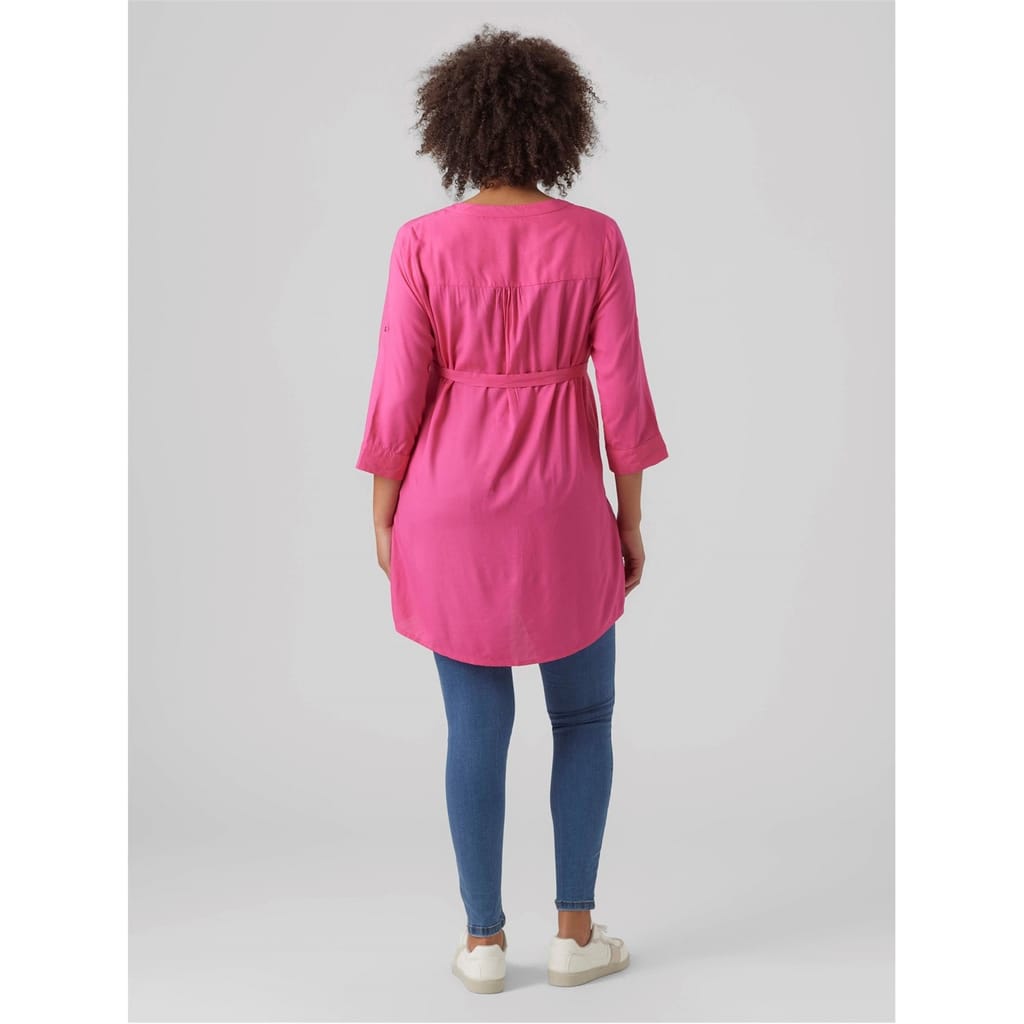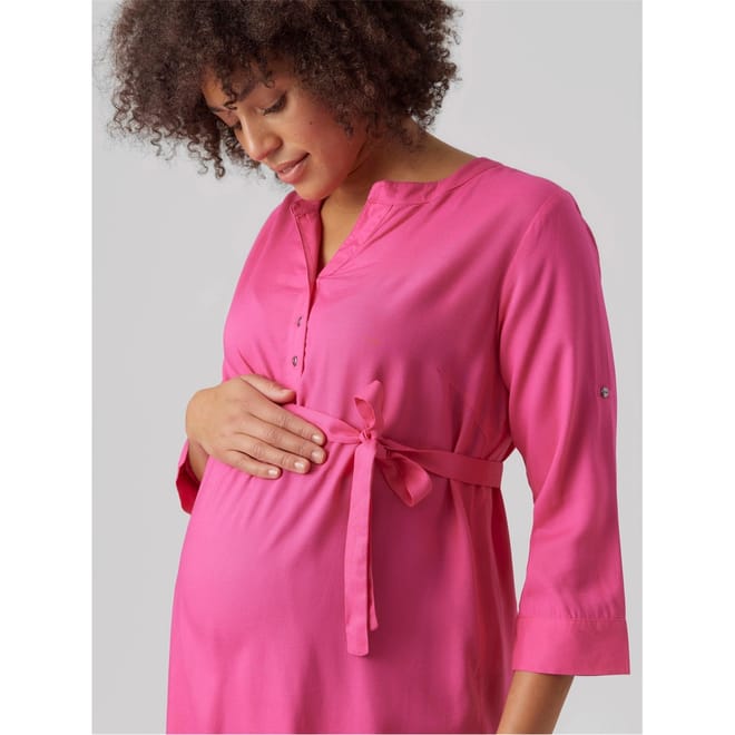 Discover the Mamalicious top, featuring a notched neck and three-quarter sleeves. This solid design offers a regular fit, complemented by a band collar for a sleek look. Perfect for those seeking a blend of style and comfort. -
