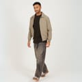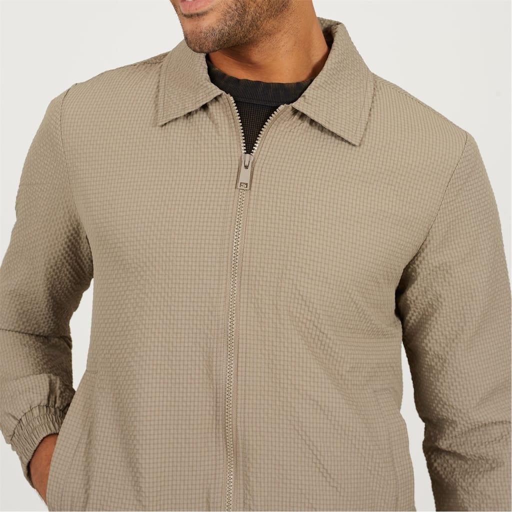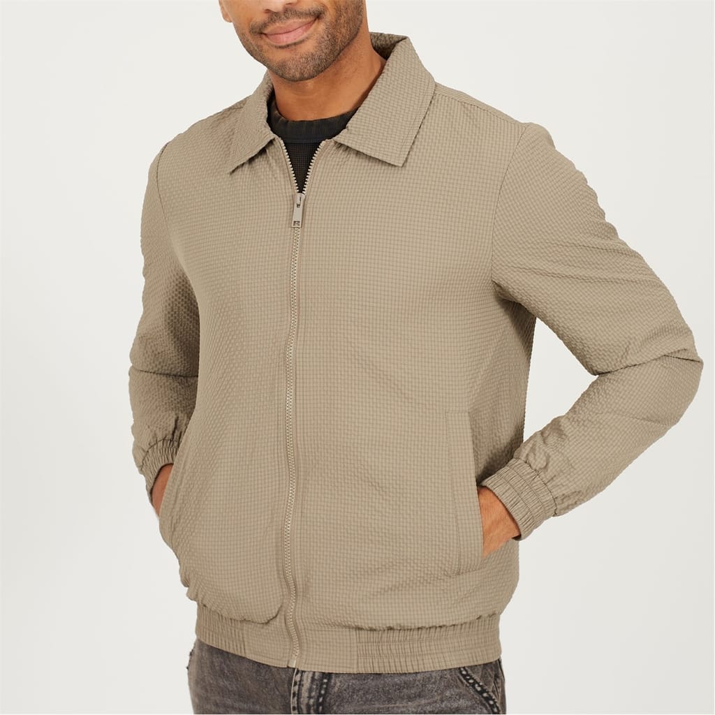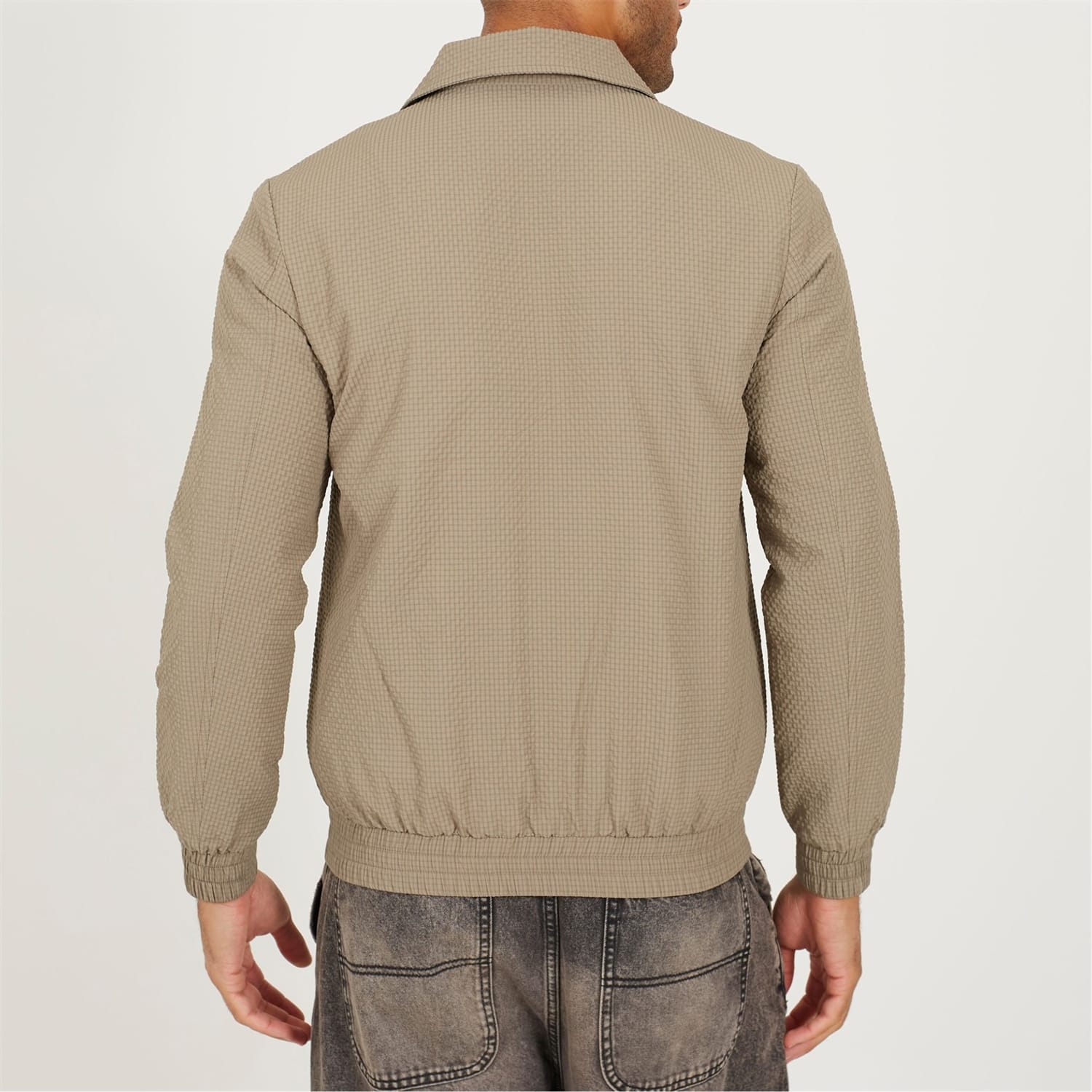 Brave Soul Men’s Taupe Harrington Seersucker Shacket. Taupe seersucker Harrington shacket with zip closure, two lower pockets, and elasticated cuffs and waistband. -