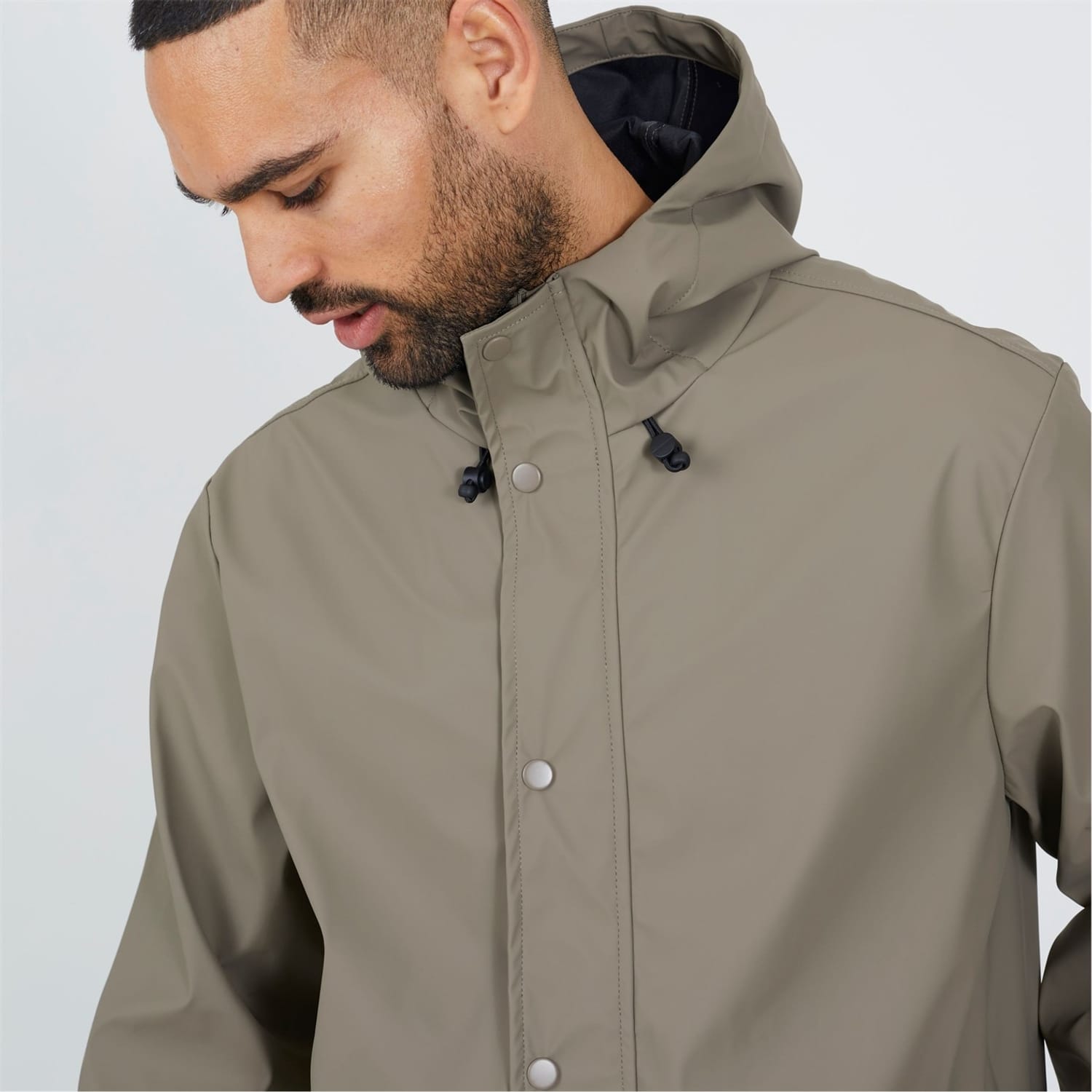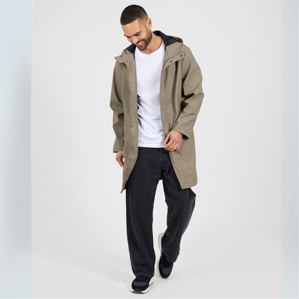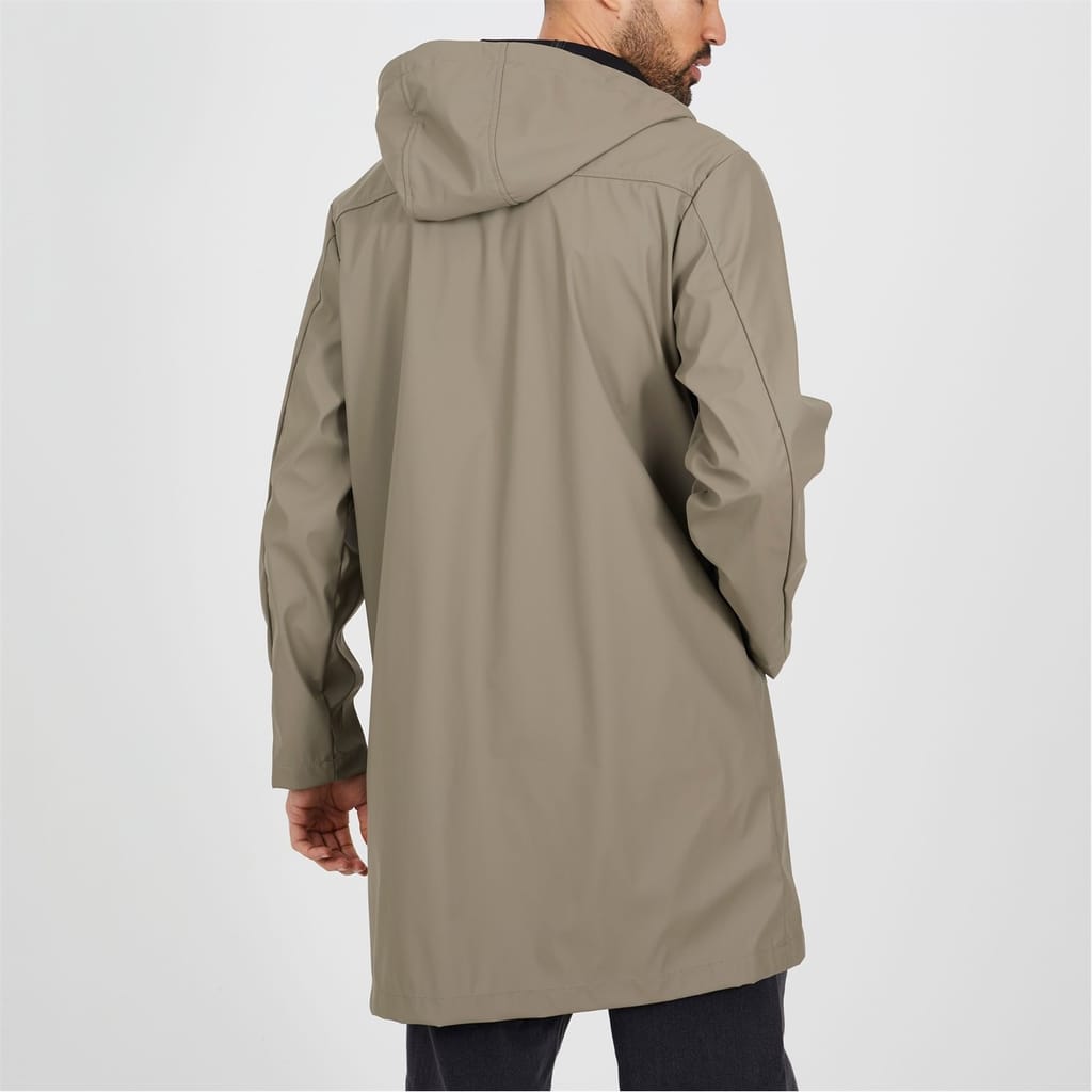 Brave Soul Men’s Rubberised Taupe Hooded Parka. Taupe hooded parka with polyurethane coating, zip closure with popper placket cover. Two lower pockets, fixed hood with bungee cord adjusters. -