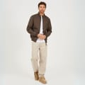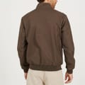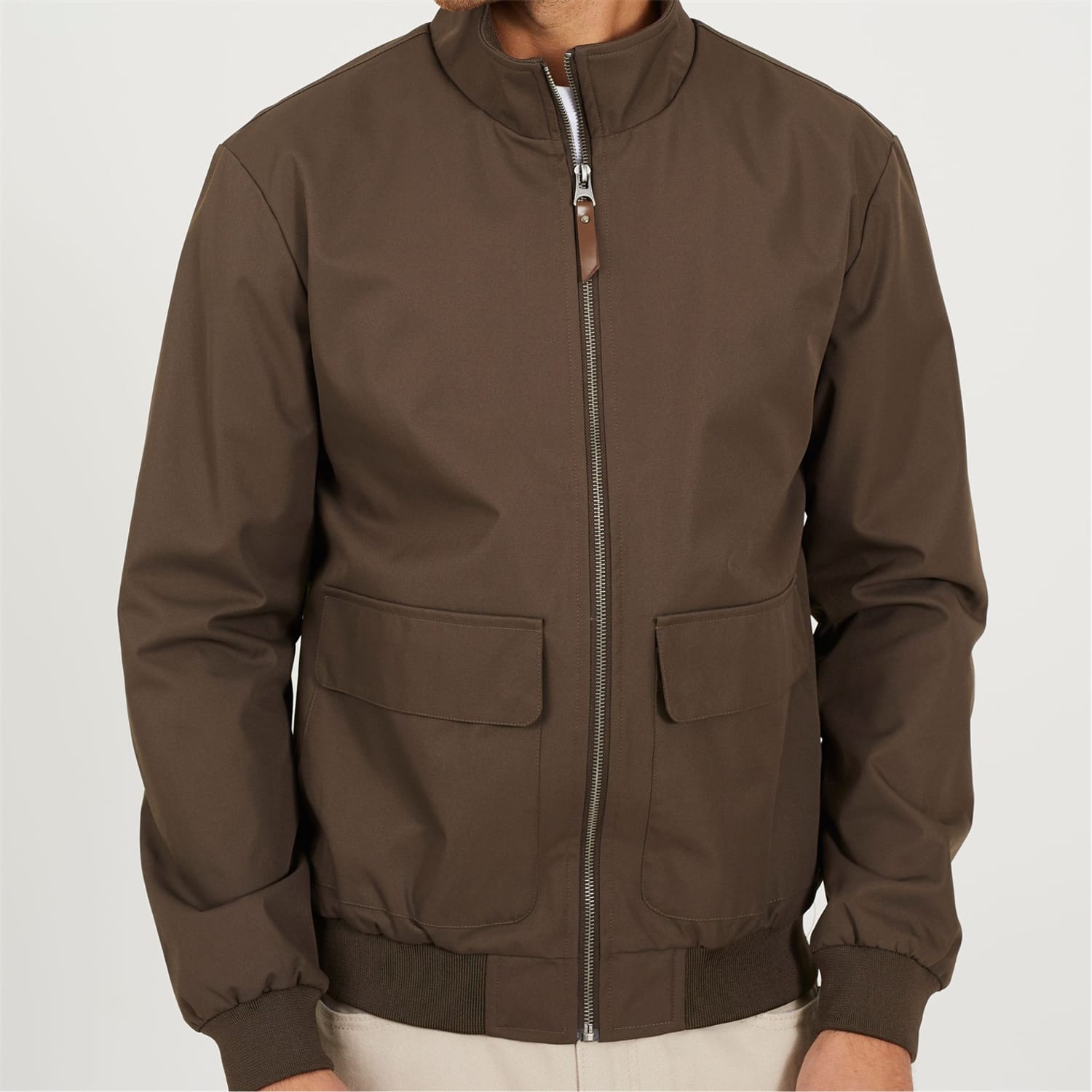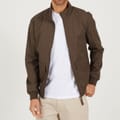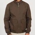 Brave Soul Men’s Bomber Jacket. Mocha bomber jacket with zip fastening and funnel neck. Two lower pockets with flaps, ribbed cuffs, collar, and hem. -
