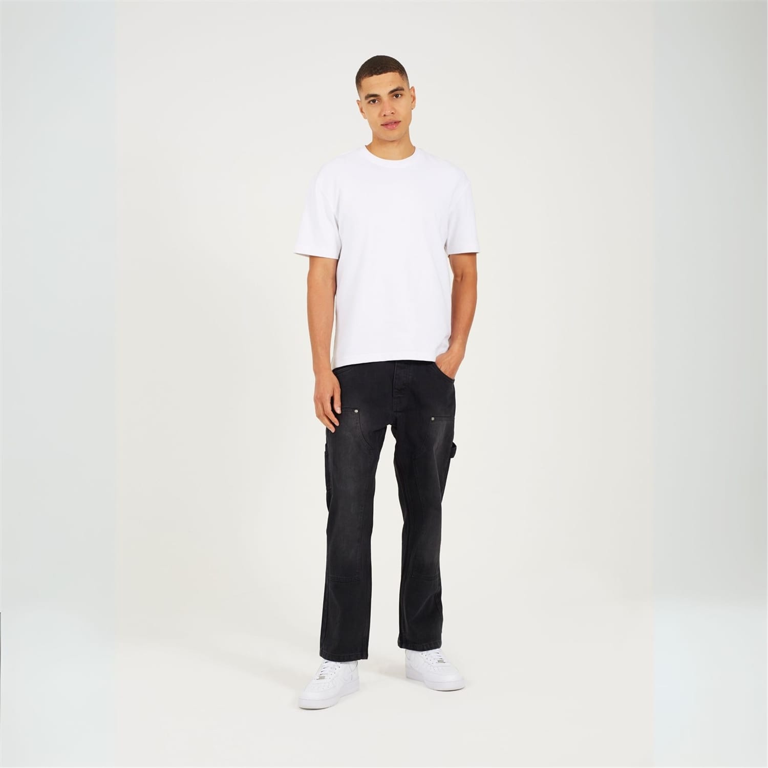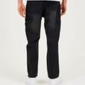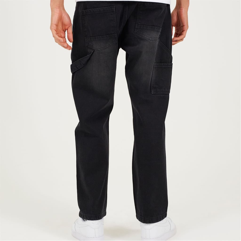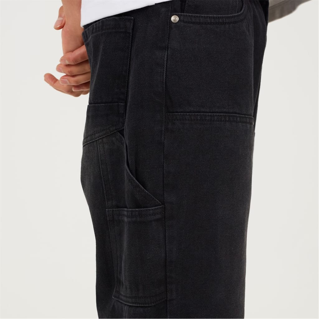 Brave Soul Men's jeans. Classic carpenter-style in a comfortable loose fit. Features a button fly, regular hem, carpenter pockets, and knee patch details. Dark charcoal wash, 100% cotton woven. -